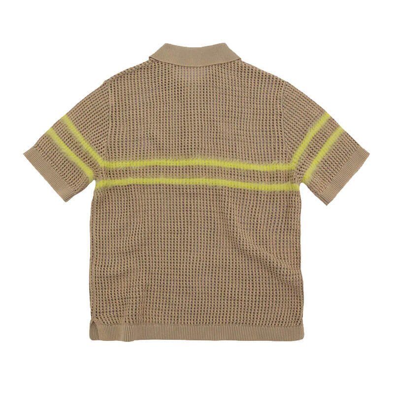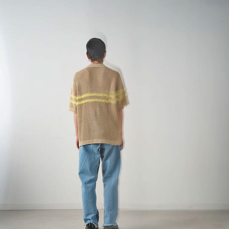 ACMH by Magic Castles Kember Polo – Ecru: A crochet knitted polo with button down ribbed collar and placket. Contrast fluffy yarn stripe and finished with an acid wash to create worn in look.