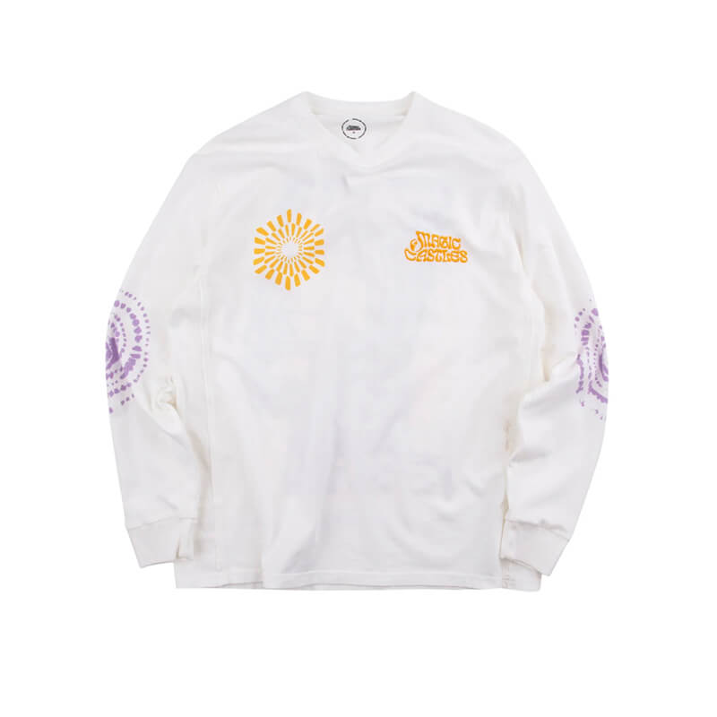 MAGIC CASTLES Pulse LS Tee – Optic White: Relaxed, slouchy long sleeve t-shirt with dropped shoulder, side panels and embroidered details.