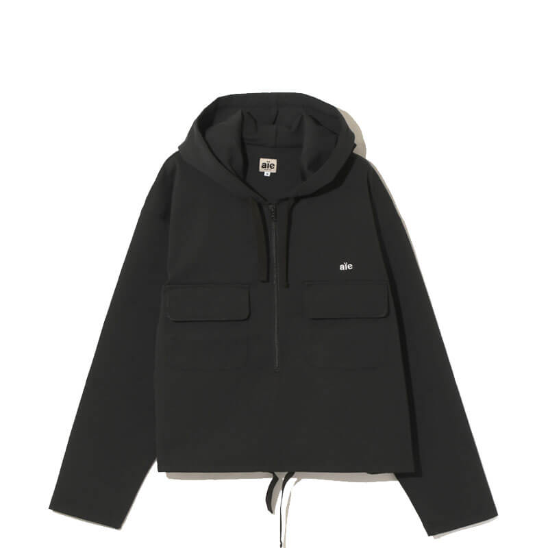 AÏE SPO Hoody – Double Knit Black: A classic SPO hoodie with a short length, a roomy width, and a wide zip front. The brand logo is subtly embroidered on the chest. The material is a lightweight, moisture-wicking, quick-drying polyester double knit.