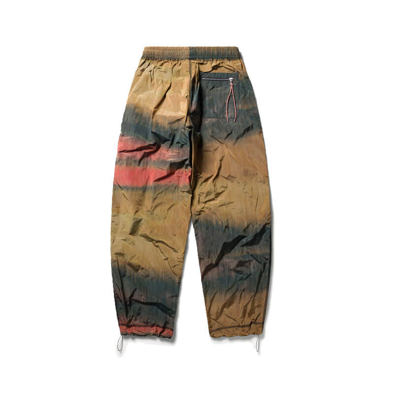 ARIES Colourfade Windcheater Pant – Multi: Unisex trackpant in a customised space-dye nylon, with an elasticated waistband, ankle toggles, reinforced knees and a zip patch pocket on the back. Aries Temple patch on the front left leg.