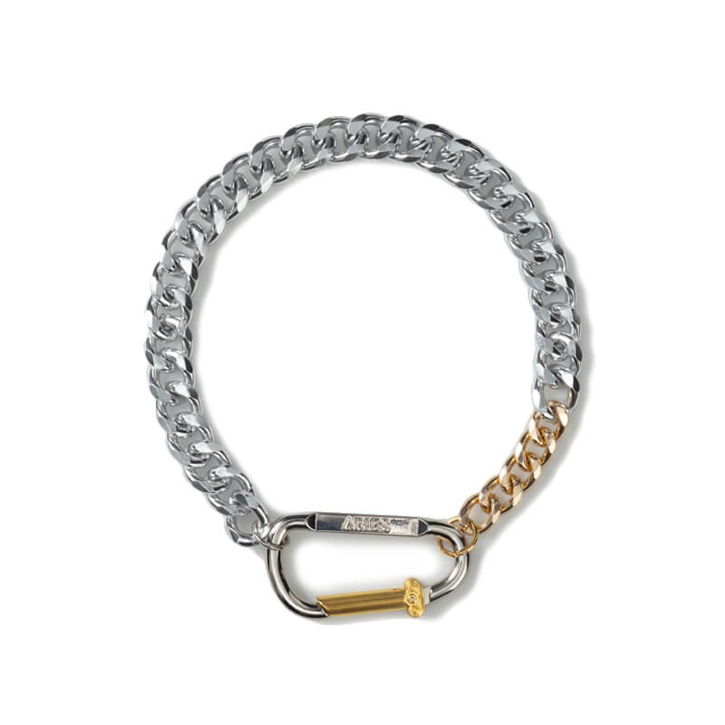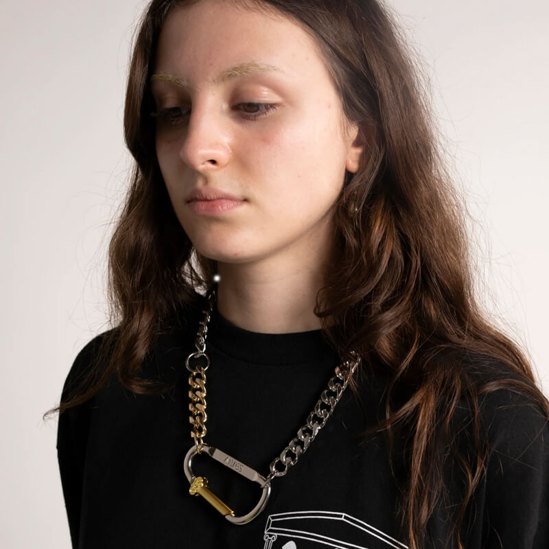 ARIES Column Carabiner Necklace – Silver: Necklace with Aries Column carabiner attached to silver chain with five gold links. This Column Carabiner Necklace – Silver is included in Aries’ SS23 collection and features: