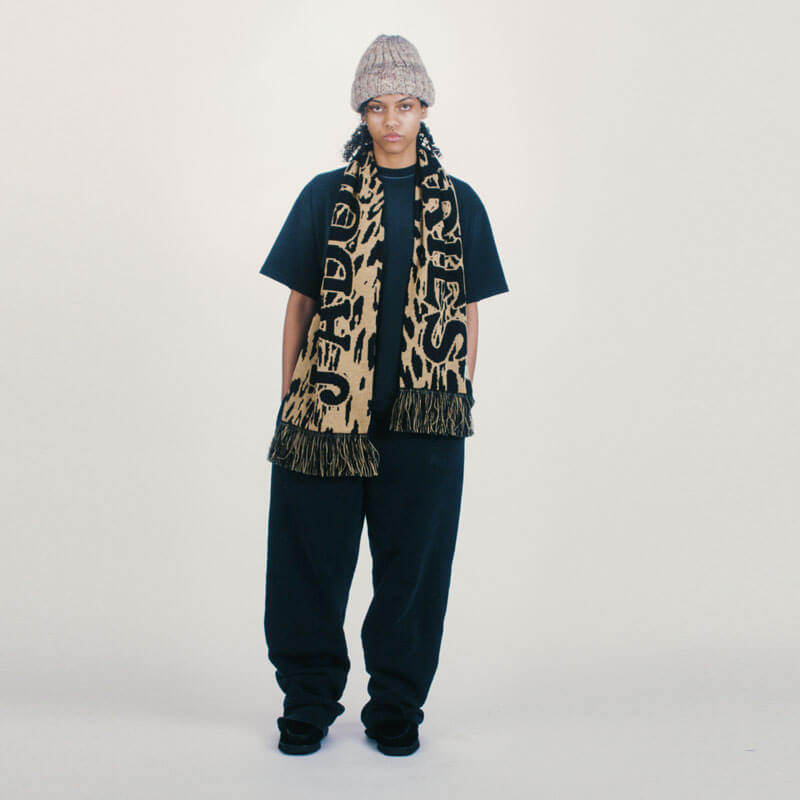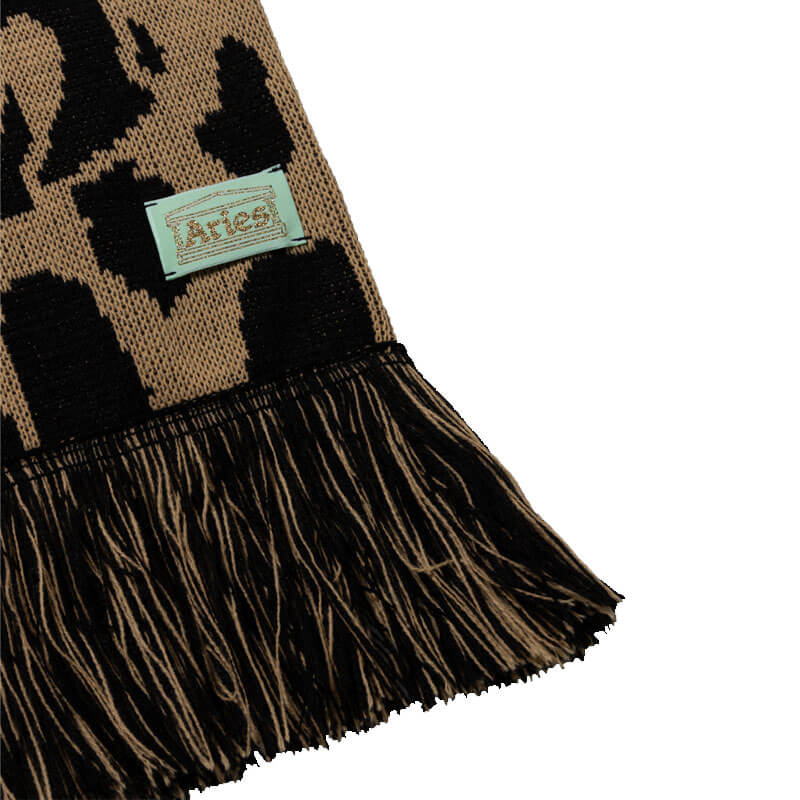 ARIES J’Adoro Aries Leopard Scarf – Beige: Knitted football-style scarf with J’Adoro Aries intarsia design, allover leopard and fringed ends.