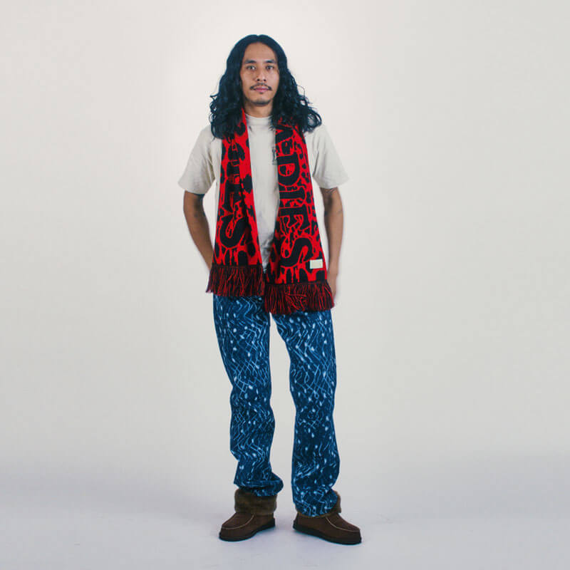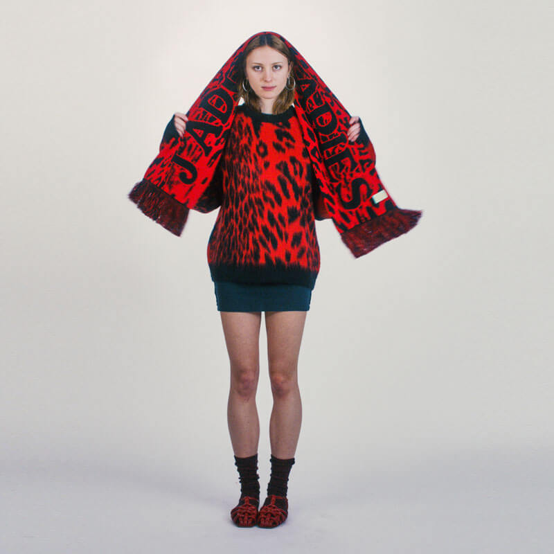 ARIES J’Adoro Aries Leopard Scarf – Red: Knitted football-style scarf with J’Adoro Aries intarsia design, allover leopard and fringed ends.
