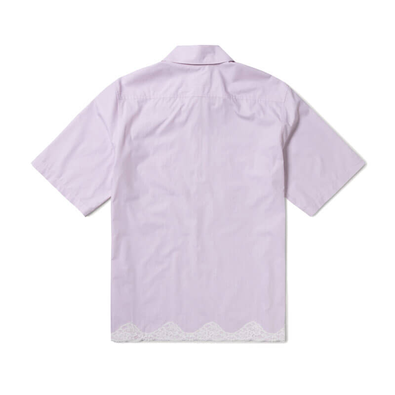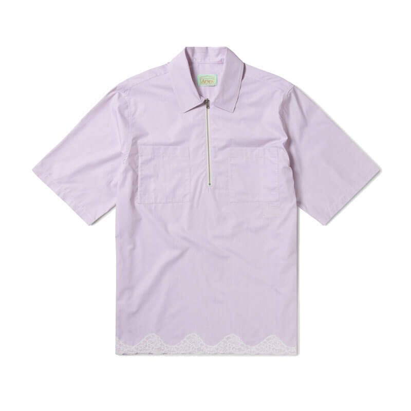 ARIES Lace Trim D Shirt – Pink: Short-sleeved half placket shirt in striped poplin cotton with chest pockets and lace trim hem, featuring embroidered Aries Temple logo.