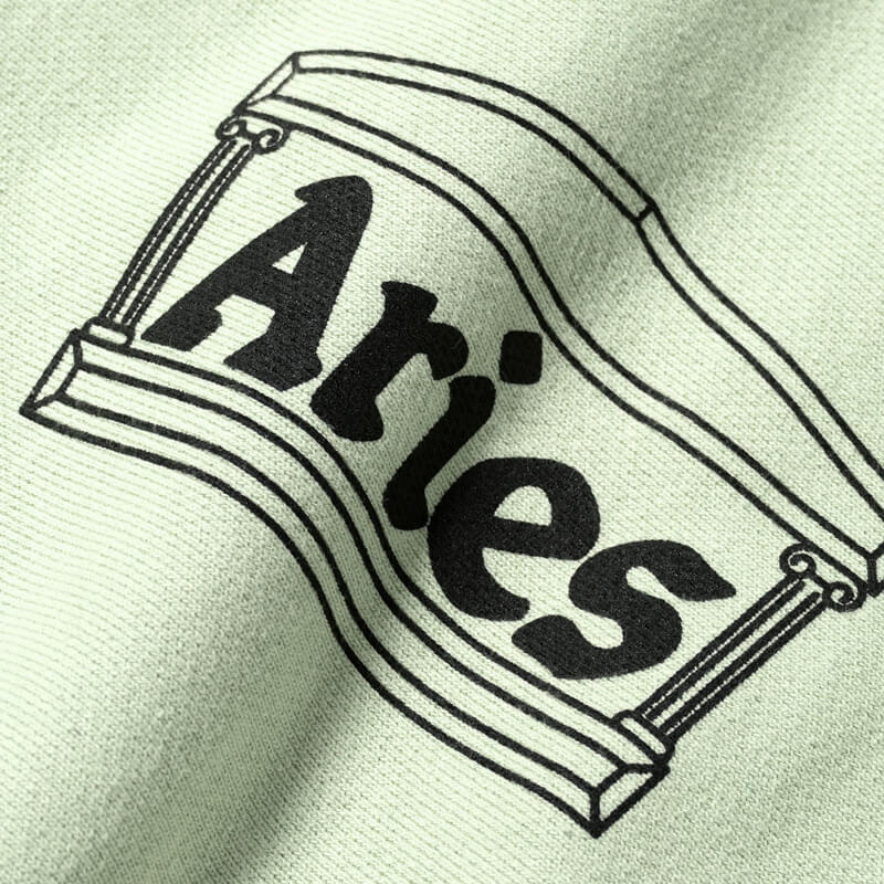 ARIES Premium Temple Sweatshirt – Pastel Green: Unisex crew sweat made from brushed-back cotton jersey fleece. Featuring Aries temple logo chest screenprint and column sleeve print. Included in Aries’s FW22 collection, this Premium Temple Sweatshirt – Pastel Green features: