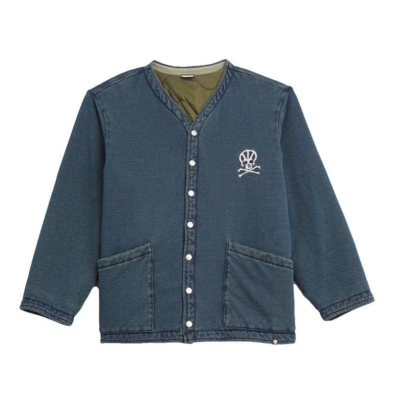 BABYLON LA Cardigan Liner – Indigo: Button-up cardigan with military padded lining. A screen-printed graphic design on chest complete the design.