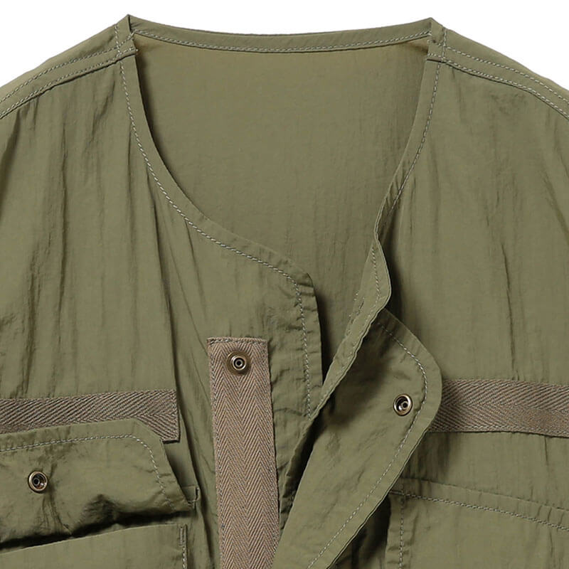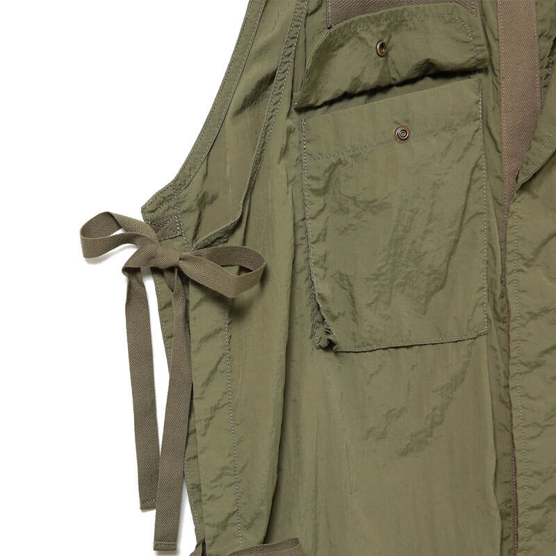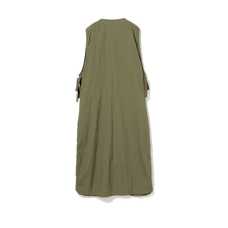 BEAMS BOY Military Side Ribbon Sleeveless Dress – Olive: This sleeveless dress brings utilitarian styling to the streetwear sphere. Bemas Boy is the sub-label of the iconic Japanese streetwear brand Beams, and was originally created in 1998 for women who love the strength and function found in men’s fashion. The brand roots itself in blurring the lines between gendered style tropes, creating pieces with substance and styling them to highlight their unique appeal. Made from durable yet lightweight nylon fabric, this military-inspired dress offers a soft, breathable feel for all-day comfort. With form and function at the forefront of its design, this dress doubles as a long vest-like overcoat with adjustable ties on sides and front pockets that add both versatility and charm.