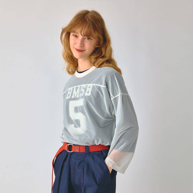 BEAMS BOY Sheer Football LS Tee – Purple: Beams Boy takes classic sportswear in a bold new direction with this sheer football top. The renowned Japanese streetwear brand Beams, introduced Beams Boy in the late ’90s as a sub-label that was dedicated to reinterpreting the functionality, style, and precision of classic menswear for women. Fully transparent and cut for a relaxed fit, it’s made for effortless layering—throw it over a tee or bralette for an elevated take on athletic-inspired styling. Sporty, playful, and packed with attitude.