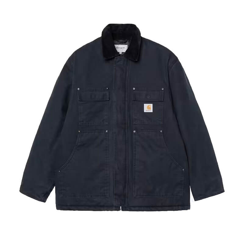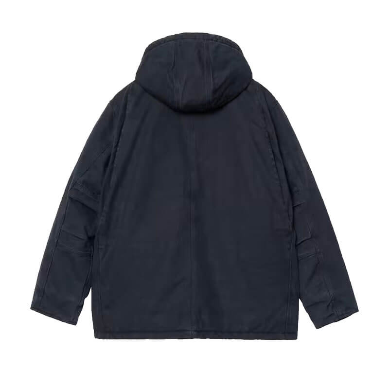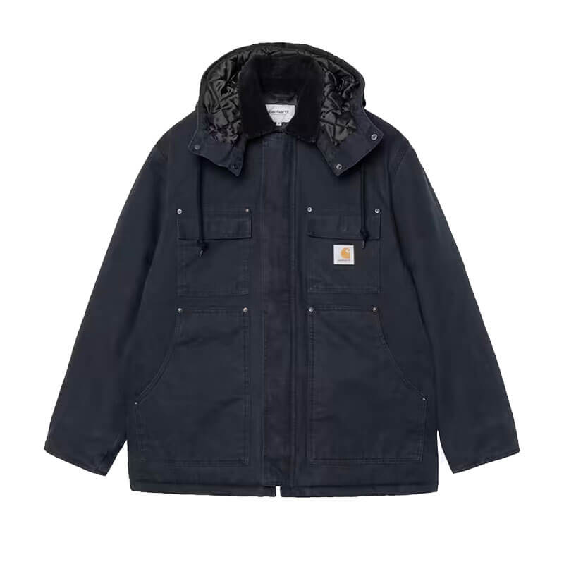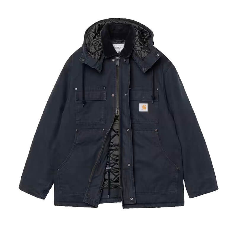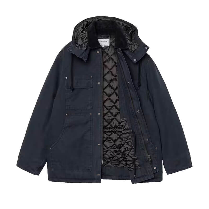 CARHARTT WIP Ambel Coat – Deep Night: The Ambel Coat is made from a heavyweight cotton canvas with a diamond-quilted lining. The style features a detachable hood and a corduroy collar. Triple stitching, bartack stitching and rivets at vital stress points provide extra durability. The item is detailed with two chest pockets and two lower side pockets. A woven Square Label completes the design.