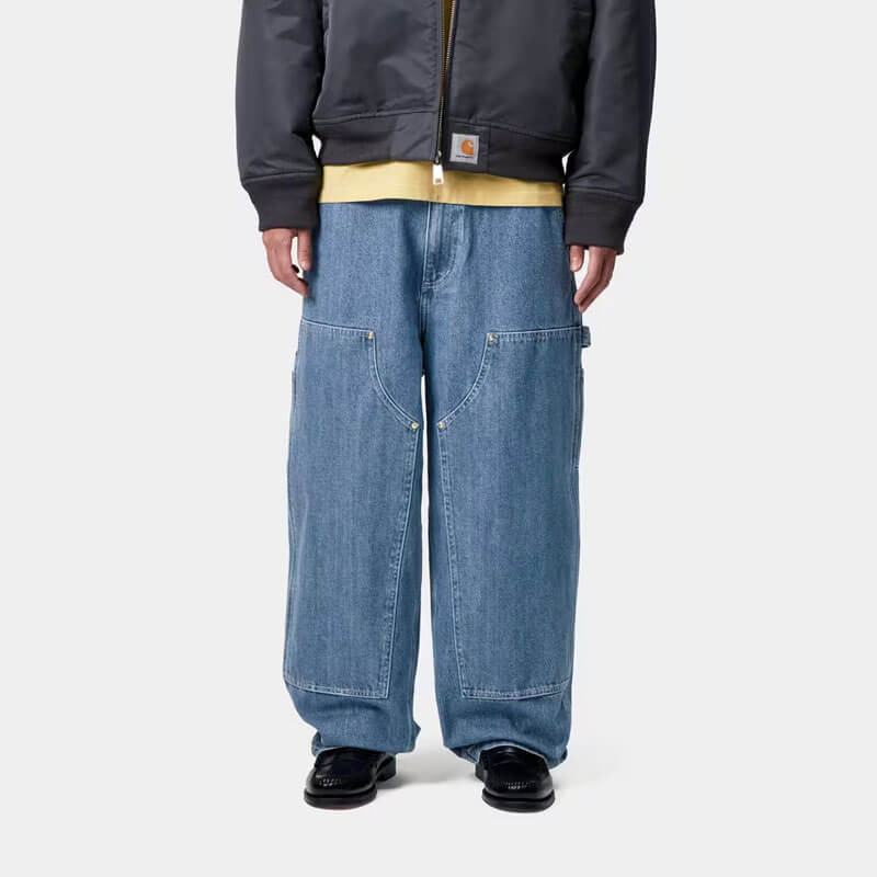 CARHARTT WIP Nash Double Knee Pant – Blue: The Nash Double Knee Pant is made from heavyweight cotton denim which has been stone-washed, offering a softer feel and unique, worn-in appearance. The item also has a loose fit with a regular waist. Triple-stitching, tool pockets and a hammer loop offer utilitarian accents. A woven Heart Label appears on the back.