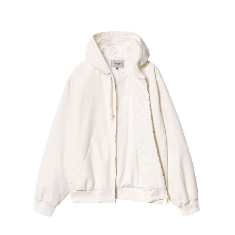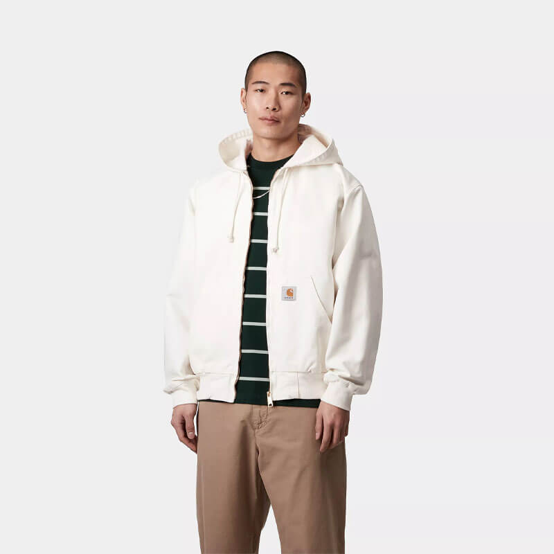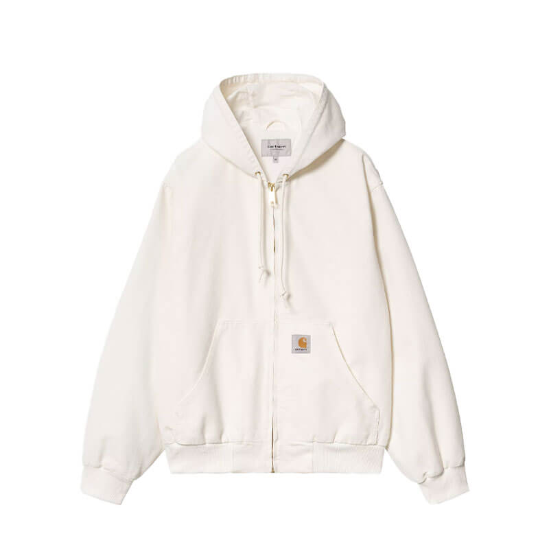 CARHARTT WIP OG Active Jacket – Wax: Hooded jacket constructed from heavyweight Dearborn Canvas, featuring a poplin-lined body and nylon-lined sleeves. The item is made in Carhartt’s original loose fit, which is slightly more boxy and oversized. It also features cinching rib-knit trims. A kangaroo pocket, inside chest pocket, and adjustable hood offer functional touches, while triple-stitch details provide extra durability. A woven Square Label completes the design.
