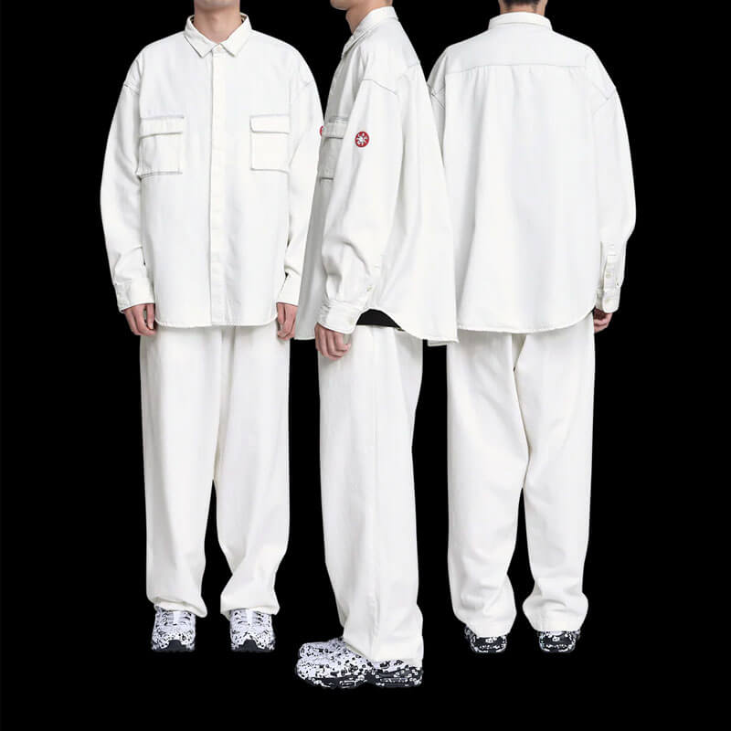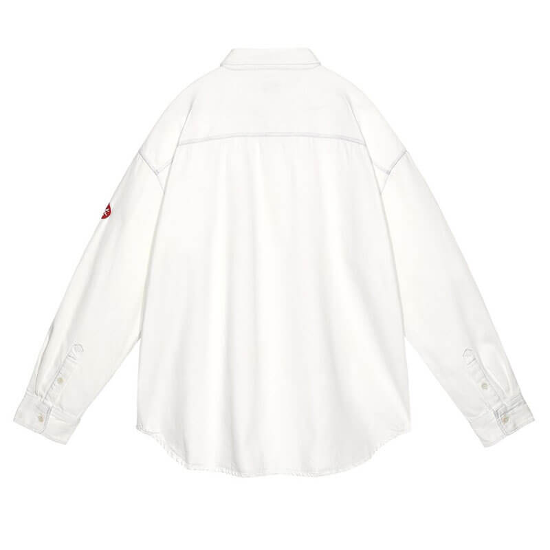 CAV EMPT Ult Bleached Denim Big Shirt – White: Cav Empt long sleeve shirt crafted in a 10oz bleach washed denim. Pre-washed to avoid shrink with a bio process, this garment is finished with two below pockets on front and silicone patch on upper left sleeve.