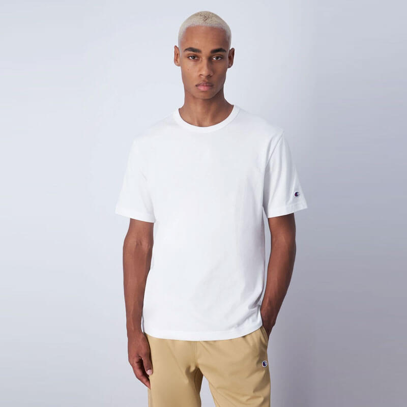 CHAMPION REVERSE WEAVE Classic Tee – White: Short sleeve tee with embroidered patch logo on sleeve. This cotton jersey t-shirt is all about timeless and effortless style. Crafted from premium fabric, it is a versatile choice to elevate any casual look. Included in the last FW23 delivery, the CHAMPION REVERSE WEAVE Classic Tee – White features: