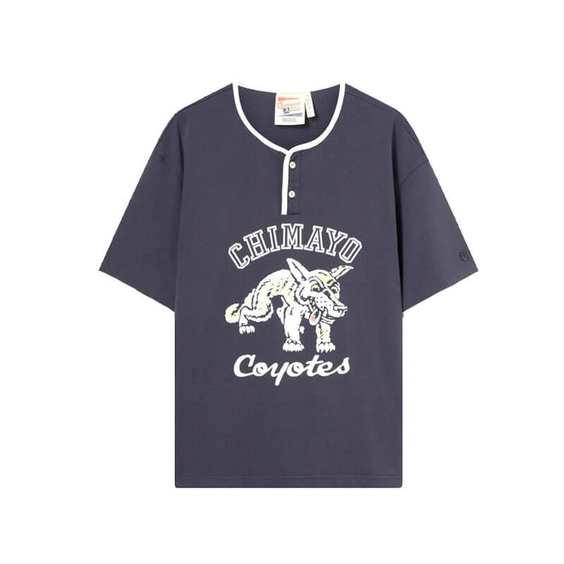 CHAMPION Sunset Ranch SS Sweatshirt – Graphite: This short-sleeve crewneck T-shirt with button placket is part of the Index & Archives – Sunset collection, inspired by 1970s New Mexico and rooted in American college aesthetics. Made from heavyweight 100% cotton jersey, it features a relaxed fit and archival details, blending authenticity and retro style with a modern twist.