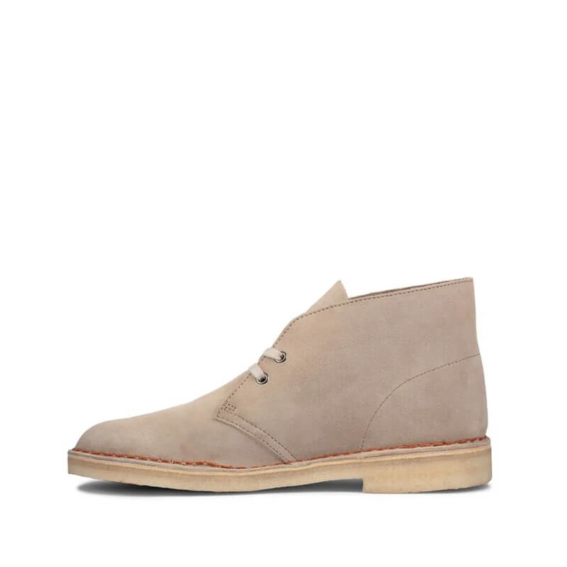 CLARKS ORIGINALS Desert Boots – Sand Suede: Cultural cachet and design DNA: no shoe is quite like the Clarks Originals Desert Boot. Nathan Clark’s 1950 design was inspired by a rough boot from Cairo’s Old Bazaar, and its minimal, progressive style sparked a worldwide footwear revolution – worn by beatniks, mods, Britpop bands, and Jamaican rude boys, from Paris to Kingston, Tokyo to London. Every design detail today remains true to that first pioneering pair – here, the boot’s crafted, clean lines are enhanced with premium suede, finished with an unfussy lace fastening. The authentic, sustainably sourced crepe sole completes this distinctive silhouette. Instantly recognisable, forever iconic. A true original.