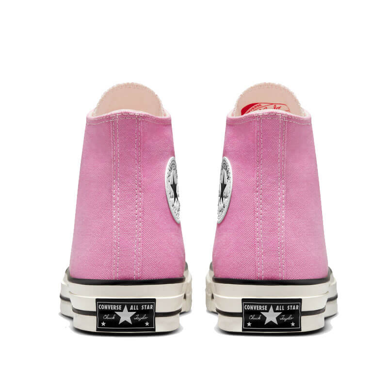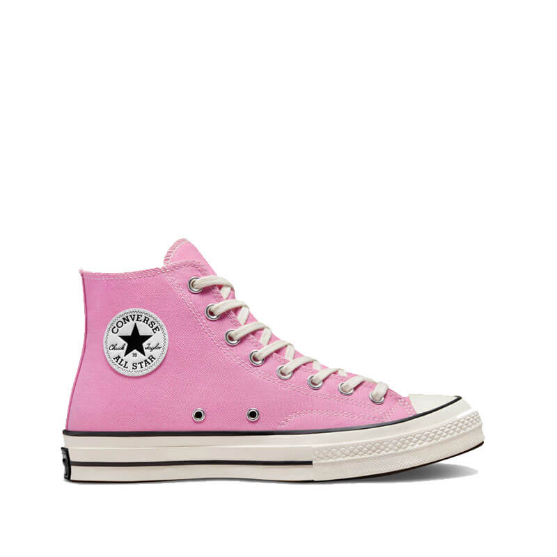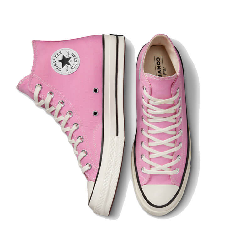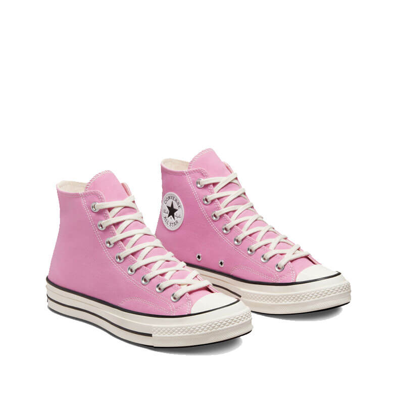 CONVERSE Chuck Taylor 70s HI – Amber Pink / Egret: By 1970, the Chuck Taylor All-Star evolved into one of the best basketball sneakers, ever. The Chuck 70 celebrates that heritage by bringing together archival-inspired details with modern comfort updates. Ortholite insole cushioning and winged tongue stitching take the comfort level up a notch. A glossy, egret midsole and signature star ankle patch bring out the shoe’s iconic, vintage style. This CONVERSE Chuck Taylor 70s HI – Amber Pink / Egret features: