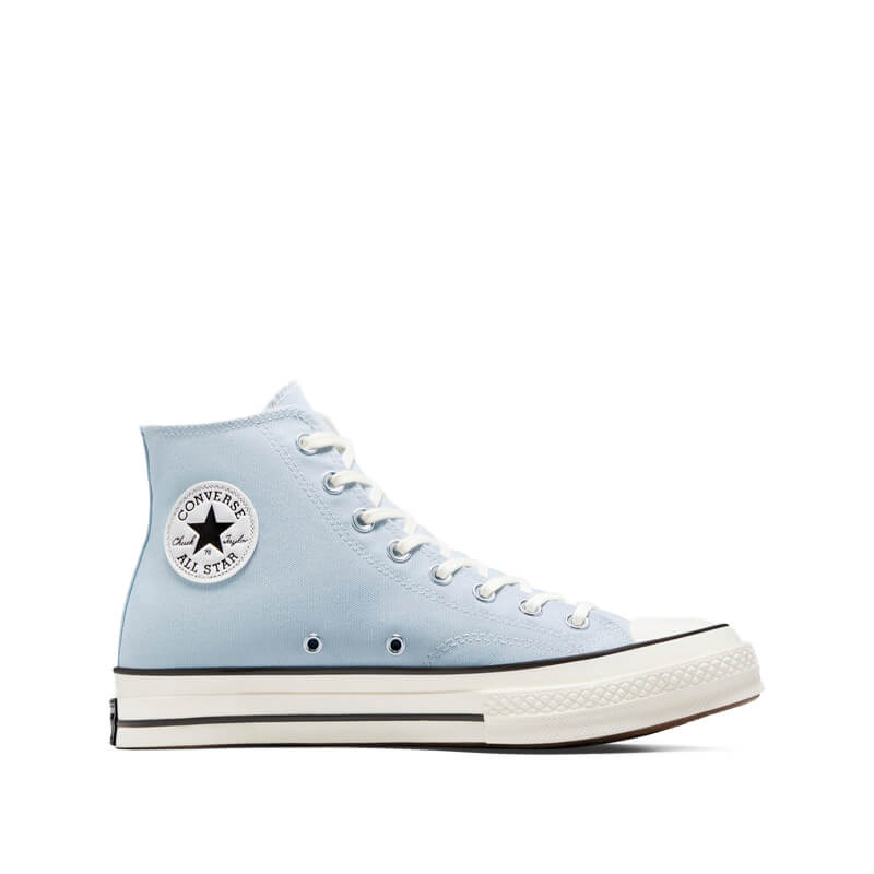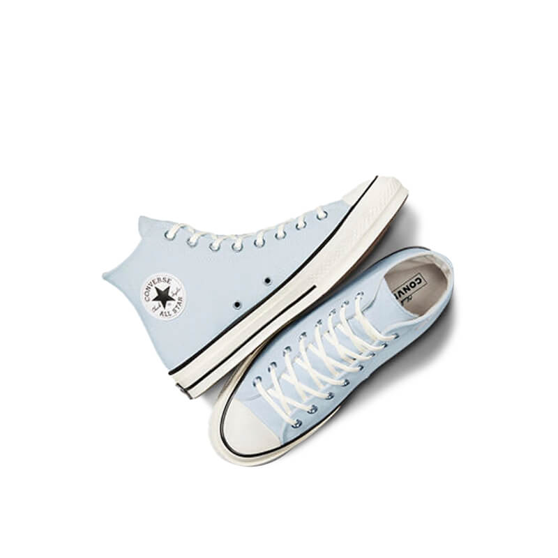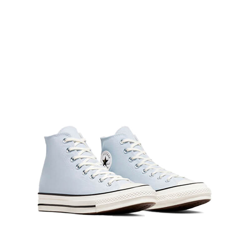 CONVERSE Chuck Taylor 70s HI – Cloudy Daze / Egret: By 1970, the Chuck Taylor All-Star evolved into one of the best basketball sneakers, ever. The Chuck 70 celebrates that heritage by bringing together archival-inspired details with modern comfort updates. Ortholite insole cushioning and winged tongue stitching take the comfort level up a notch. A glossy, egret midsole and signature star ankle patch bring out the shoe’s iconic, vintage style. This CONVERSE Chuck Taylor 70s HI – Cloudy Daze / Egret features: