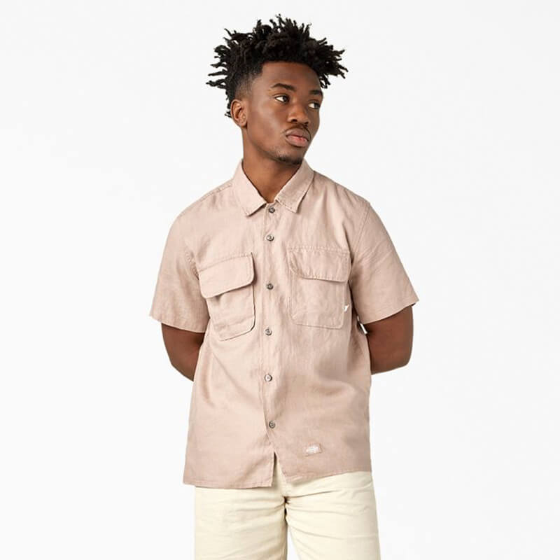 DICKIES Linen Work Shirt – Fawn: Crafted for comfort, function and durability, our Linen Short Sleeve Work Shirt is a timeless workwear style created in collaboration with renowned guest designer Nin Truong. With its relaxed fit, straight hem and classic collar, this short sleeve shirt is smart enough for work but stylish enough for off-duty adventures. Plain weave linen makes this shirt cool in warm weather, giving you the confidence to step out all summer long.
