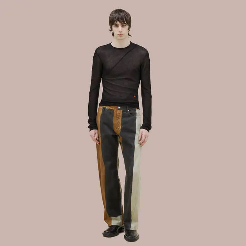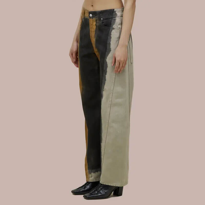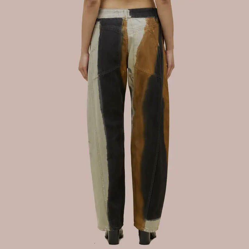 ECKHAUS LATTA Bend Jean – Pigment: Mid-rise jean in 14oz cotton indigo denim, bleached to a bright white base and hand-painted with graphic rust and black placements. Features a bowed leg with twisted side seams and signature EL back pockets.