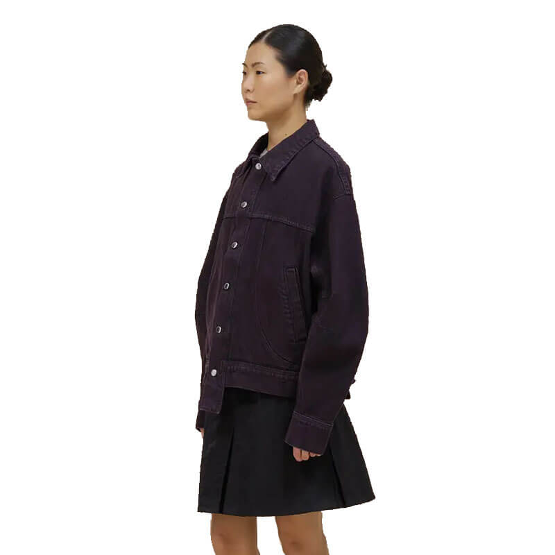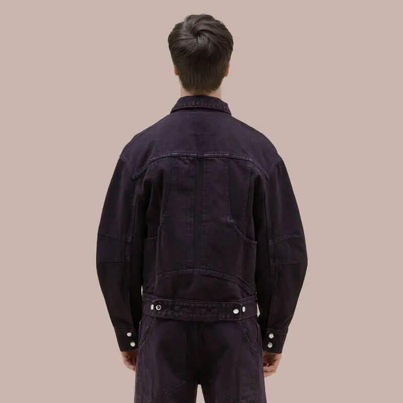 ECKHAUS LATTA EL Jacket Redux – Amethyst: Made of 14oz black cotton denim which has been garment dyed a vibrant purple and stonewashed for a vintage finish. Designed with a natural fit, rounded sleeves, and a button front placket with extension. Features welt pockets at the front and EL-style pockets at the back.