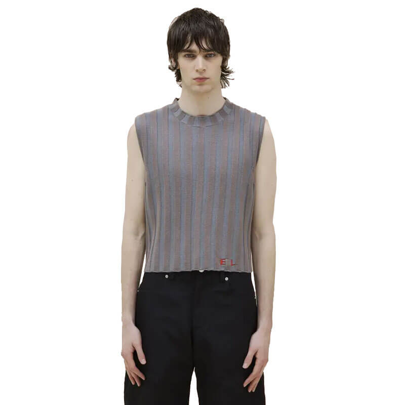 ECKHAUS LATTA Keyboard Vest – Heron: Classic boxy crewneck vest in 100% merino wool with a contrast striped wide rib. Features Eckhaus Latta new intarsia knit EL logo in red.