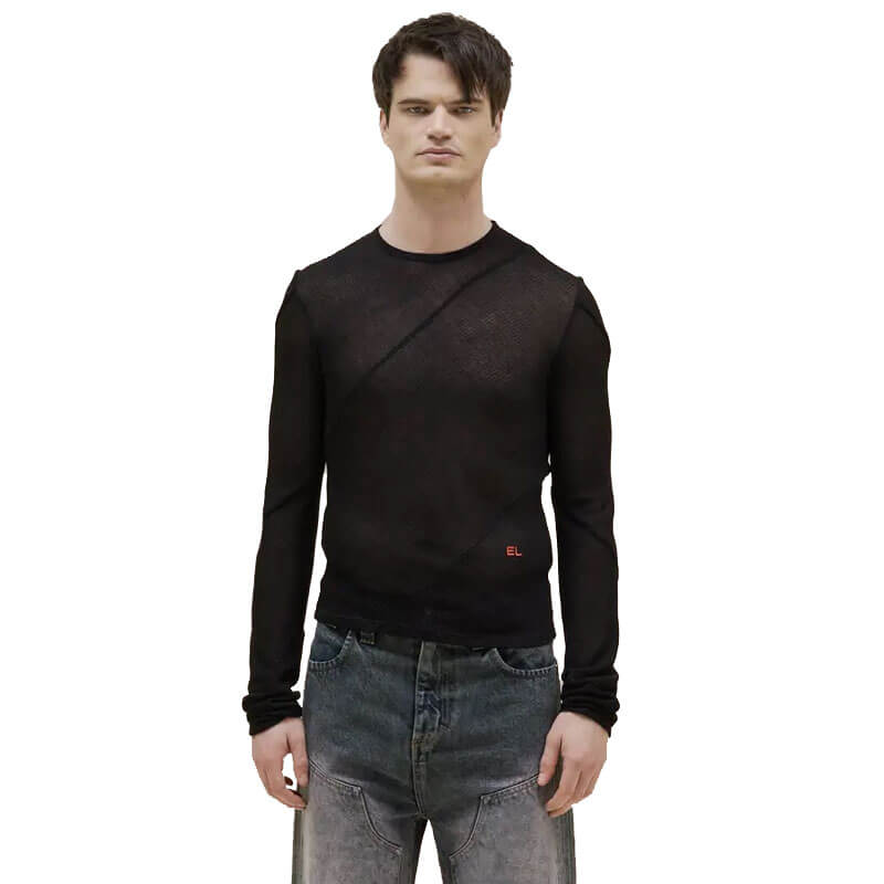 ECKHAUS LATTA Spiral Long Sleeve – Jet: Bias cut longsleeve crewneck made from an open gauge semi-sheer rib. Sleeves constructed with spiraling seams and finished with red EL logo embroidered on the lower left abdomen.