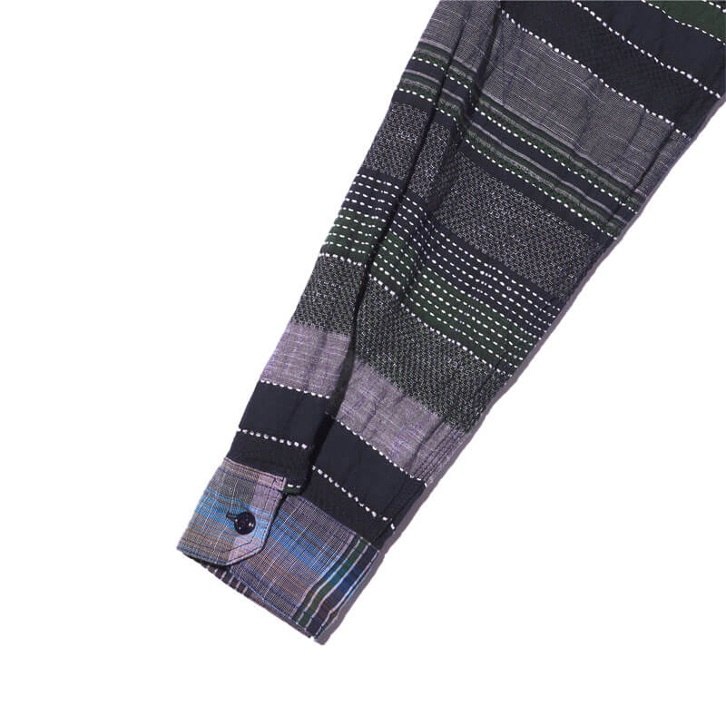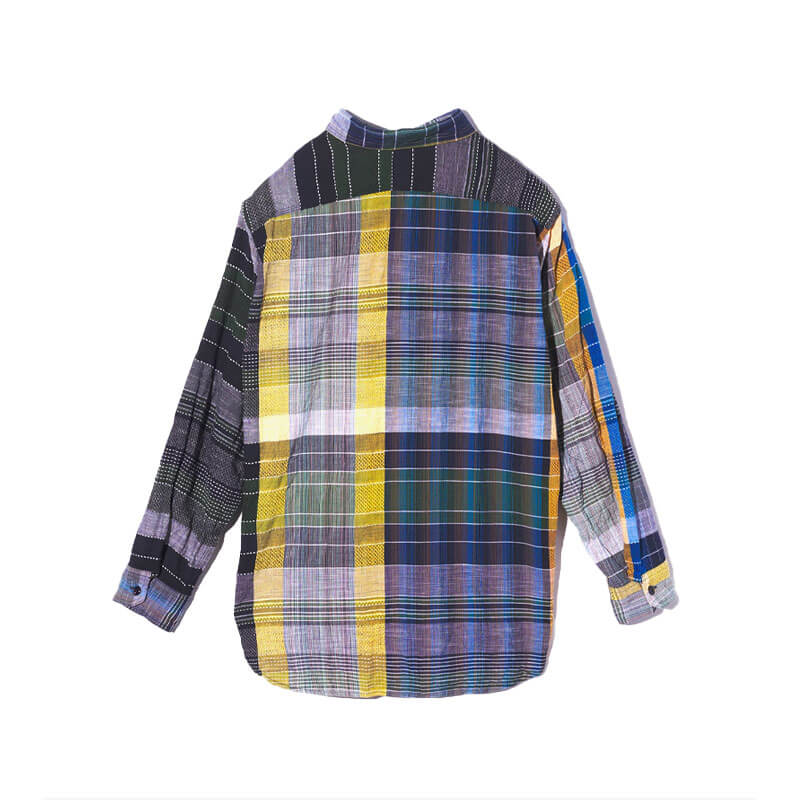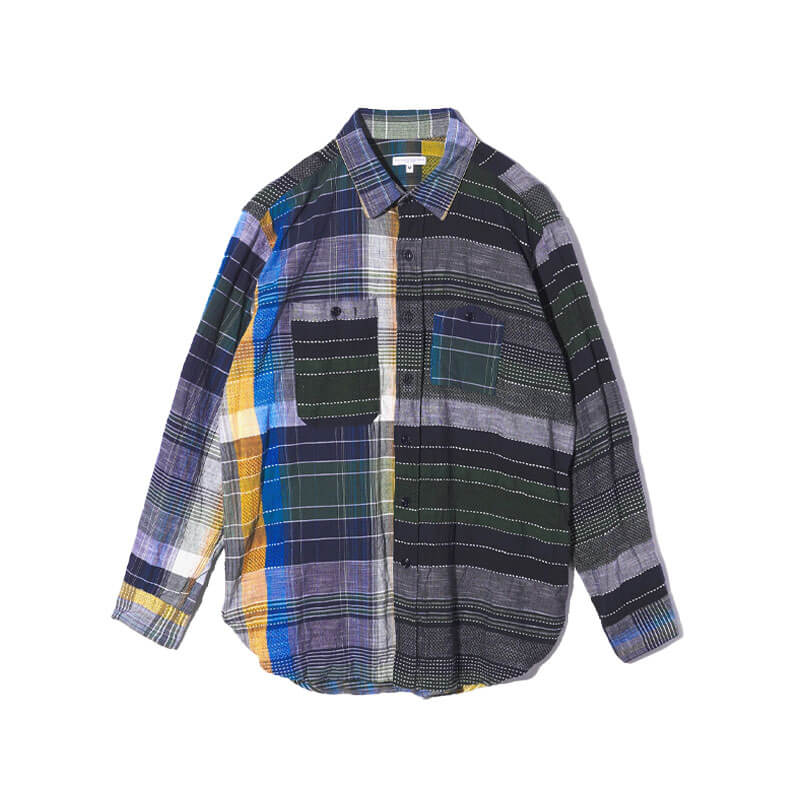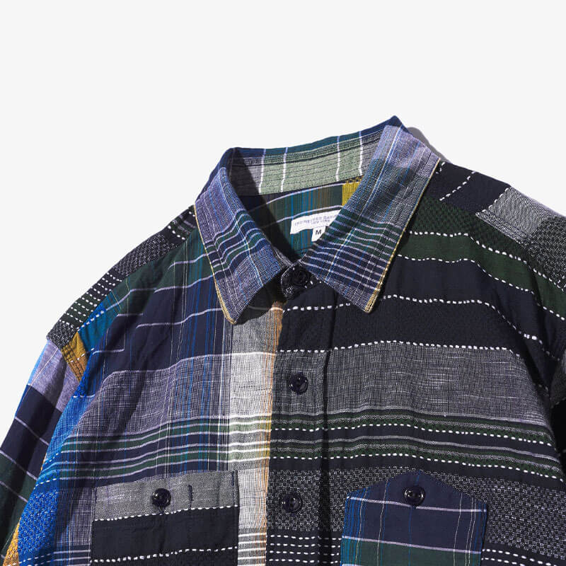ENGINEERED GARMENTS Work Shirt – Work Shirt – Navy / Yellow / Green Madras: The Engineered Garments Work Shirt reimagines a timeless workwear staple with a bold patchwork construction. Made in the USA from 100% cotton, this shirt features a mix of plaid and stitch-patterned panels, creating a textured, handcrafted look. Designed with a relaxed fit, it includes buttoned chest patch pockets, adjustable cuffs, and a scooped hem for added versatility. A standout piece that blends rugged utility with expressive detailing.