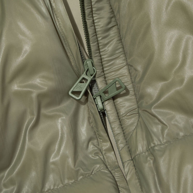 F/CE. Pertex Minimal Padding Parka – Olive: The outer fabric continues to be made from PERTEX QUANTUM material made from 100% recycled waste fishing nets. By changing the filling from down to PrimaLoft, it is now easy-care and can be hand-washed. The unique matte sheen of the material gives it a luxurious impression. The minimalist design has been stripped down to the bare essentials, but this time also features a curved stitchwork design.