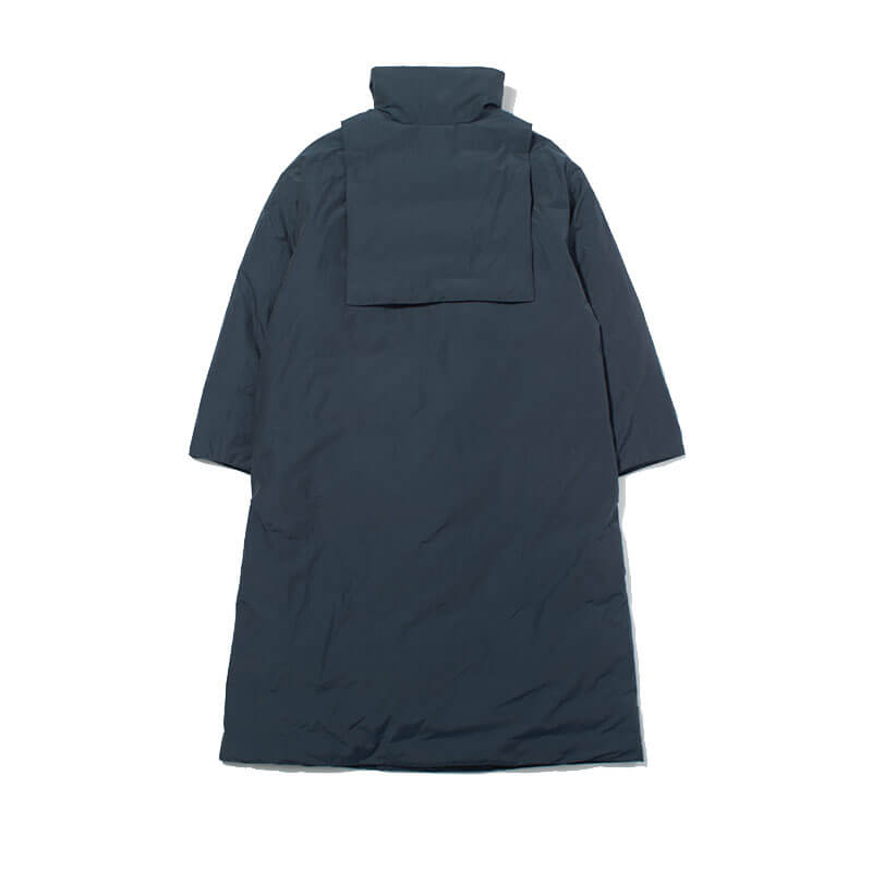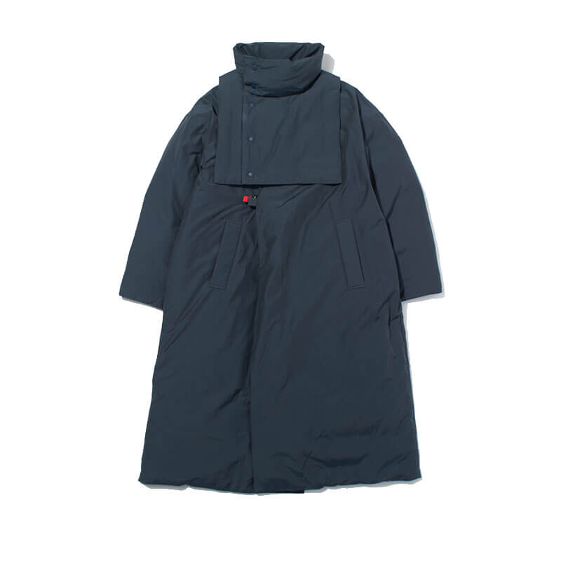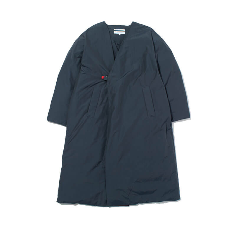 F/CE. Recycled Down 2way Stand Coat – Navy: Recycled down series. A 2-way long coat that can be worn with a V-collar or stand collar, made from 650 fill-power down that has been collected from jackets, sleeping bags and duvets and carefully re-cleaned, and recycled nylon.