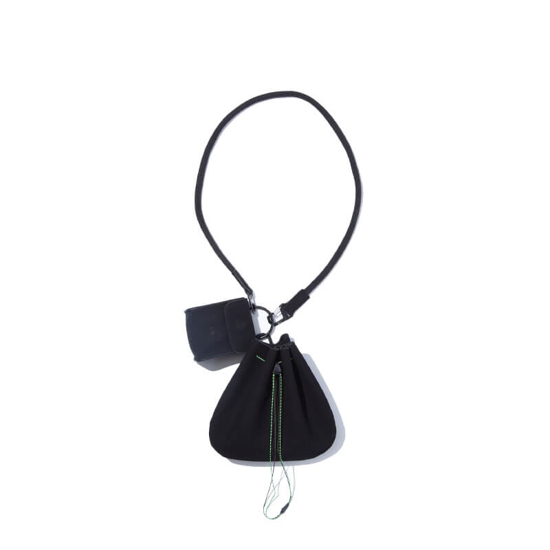F/CE. Tech Suede Chain Purse – Black: Made from Ecotech leather, a hybrid material that is 100% animal-free, water-repellent, and features stain-resistant properties. This simple, minimalist design features two miniature pouches connected with a mountain rope handle as a point of reference. The inspiration for this item was a small bag for storing small things in the hunting field. The unisex design is a fusion of elegance, fine detail, and parts that exist on the active field