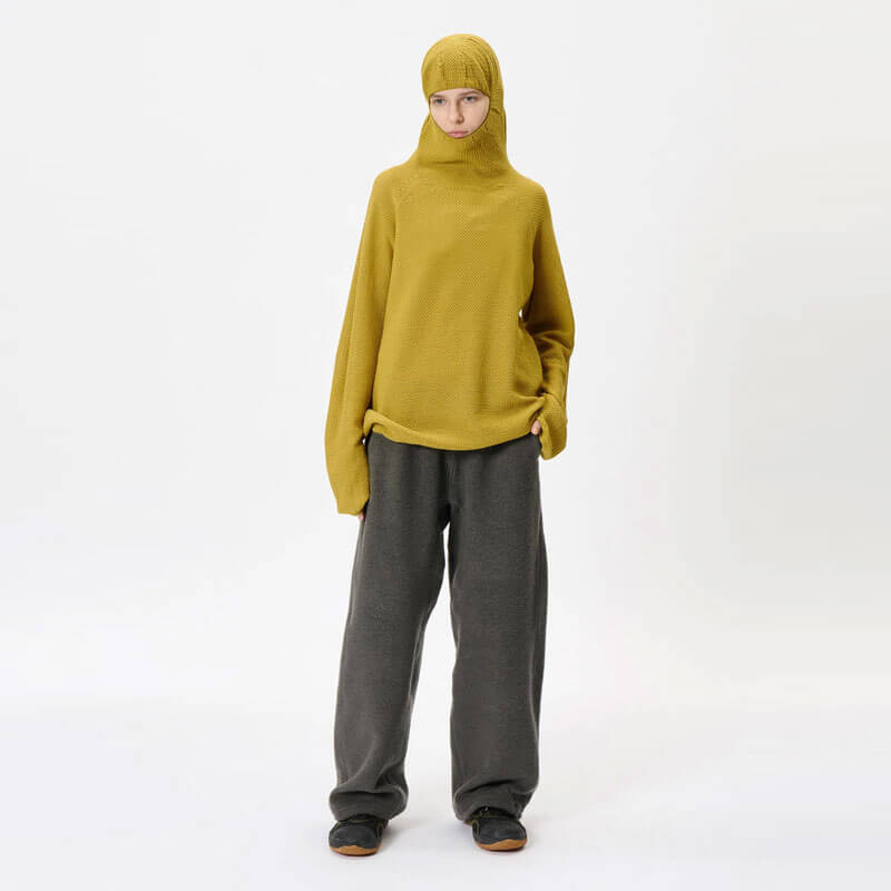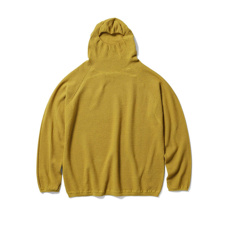 GOLDWIN 0 Perforated Wholegarment Knit Top – Bright Gold: Goldwin 0’s FW25 collection explores new forms of functional knitwear. A knit top with a balaclava-style hood, fully fashioned with a fine perforated knit structure. Made using Wholegarment seamless technology for superior comfort with no seams against the skin. A wool-polyester yarn blend provides warmth, durability, and versatility for both city life and outdoor activities.