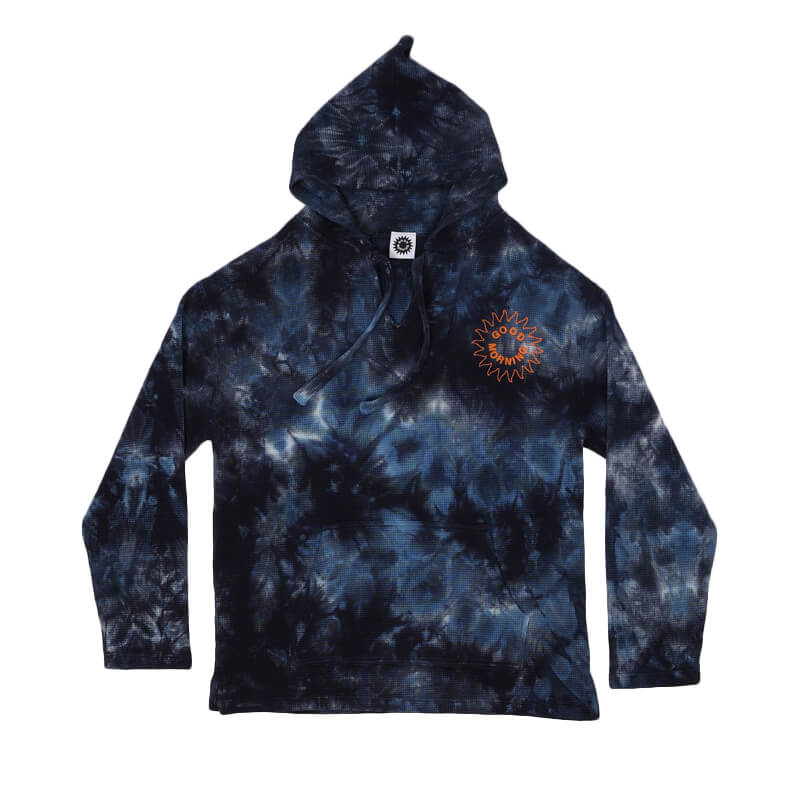 GOOD MORNING TAPES Beach Poncho – Blue Tie-Dye: Hooded pullover crafted in organic cotton with graphic print on front and back. Original merchandising from the extended family of French Recod Label Good Morning Tapes. Included in the new FW22 collection, this GOOD MORNING TAPES LSD Sun Logo Tee – Blue tie-Dye features: