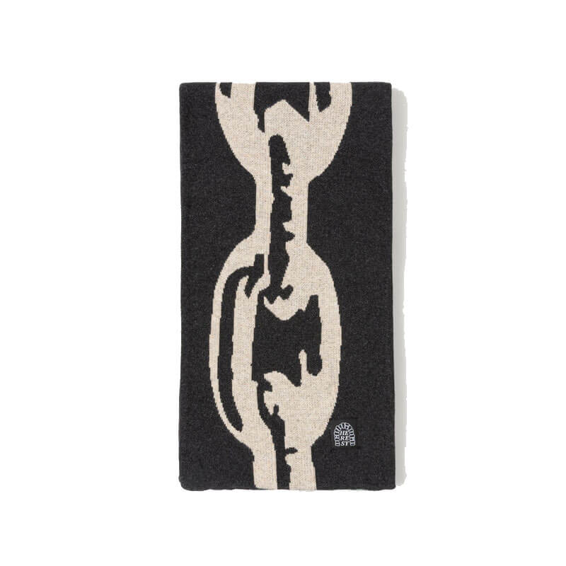 HERESY Chain Scarf – Black: Jacquard knitted scarf in ‘Chain’ logo, the scarf has a soft brushed hand feel and made out of 100% cotton yarn. The width is 200cm and height 25cm.