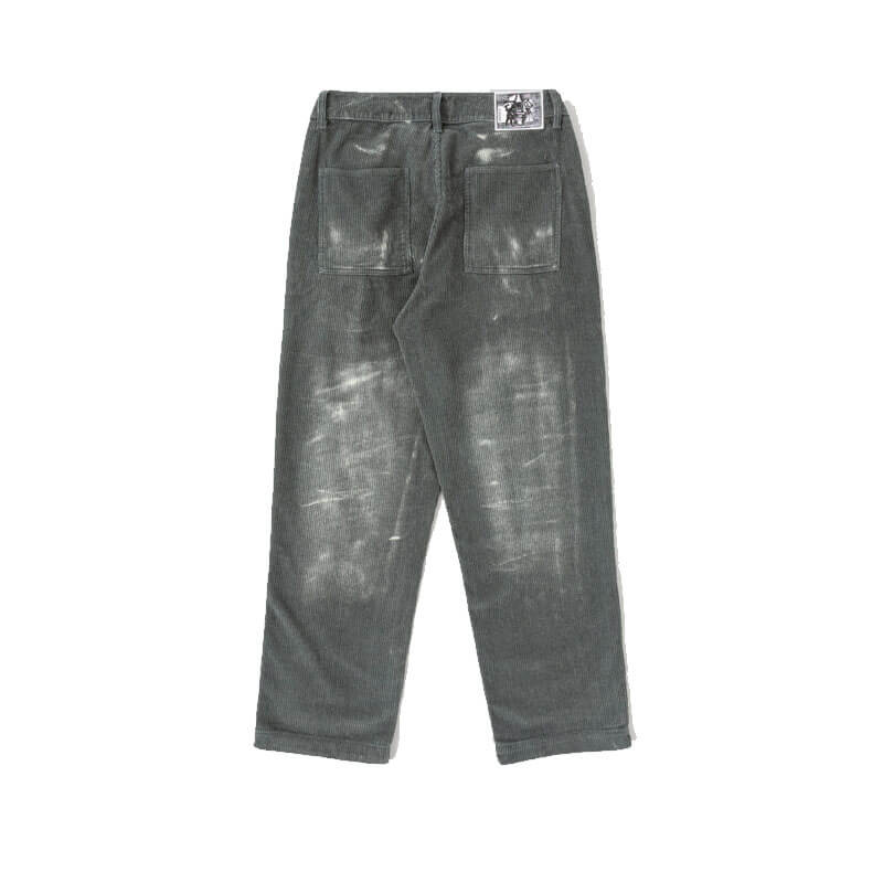HERESY Pond Trousers – Green: Trousers in bleach washed cotton cord, featuring YKK jeans button, zip and jacron paper patch on the back. Due to the nature of the washing each piece will be slightly different.