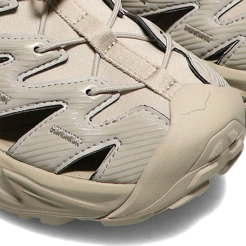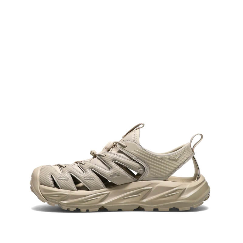 HOKA ONE ONE Hopara – Oxford Tan / Dune: A true outdoor explorer, the Hopara easily navigates through any terrain — wet or dry. Designed through the HOKA lens, this shoe will blow other mountain sandals out of the water. The Hopara has a synthetic upper with strategic cutouts for drainage while still providing a secure lockdown. It includes a neoprene collar for flexibility and comfort plus a quick-lace system. Providing a responsive yet cushioned feel thanks to a rubberized EVA midsole, the Hopara also features a rubberized toe cap for protection and a sticky rubber outsole for traction in a variety of conditions. Add in 4mm multidirectional lugs for even more grip and the Hopara is your key to adventure. This HOKA ONE ONE Hopara – Oxford Tan / Dune features: