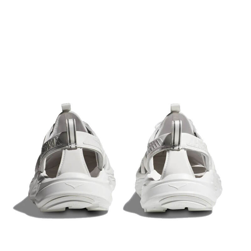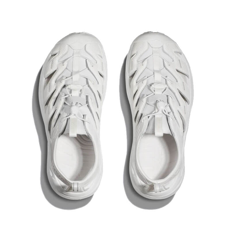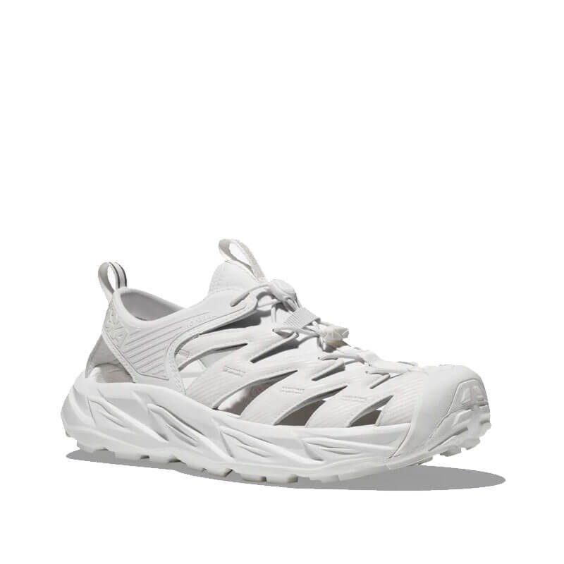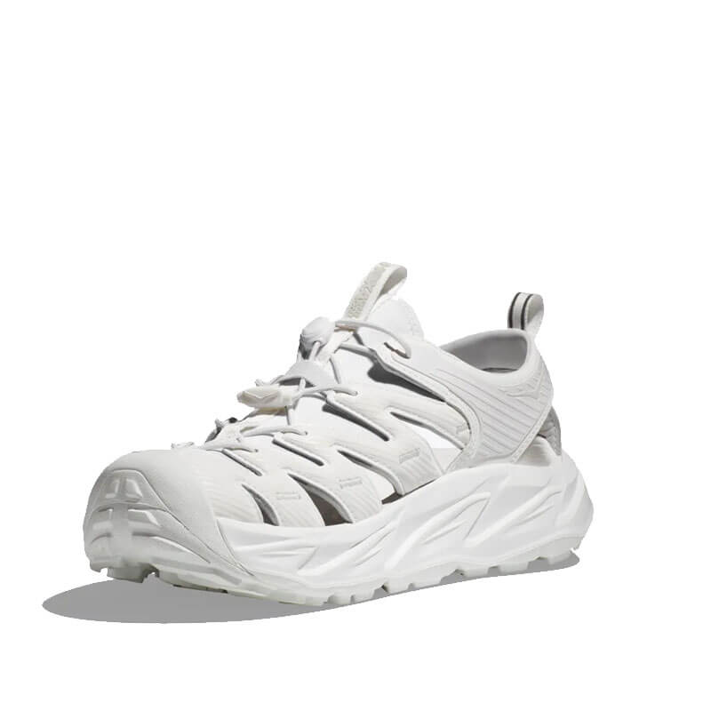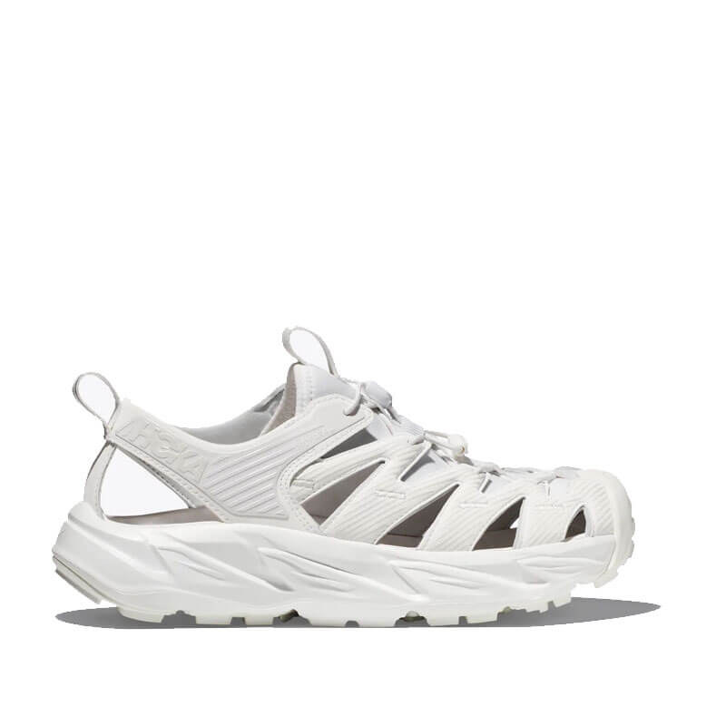 HOKA Hopara – White / White: A true outdoor explorer, the Hopara easily navigates through any terrain — wet or dry. Designed through the HOKA lens, this shoe will blow other mountain sandals out of the water. The Hopara has a synthetic upper with strategic cutouts for drainage while still providing a secure lockdown. It includes a neoprene collar for flexibility and comfort plus a quick-lace system. Providing a responsive yet cushioned feel thanks to a rubberized EVA midsole, the Hopara also features a rubberized toe cap for protection and a sticky rubber outsole for traction in a variety of conditions. Add in 4mm multidirectional lugs for even more grip and the Hopara is your key to adventure.