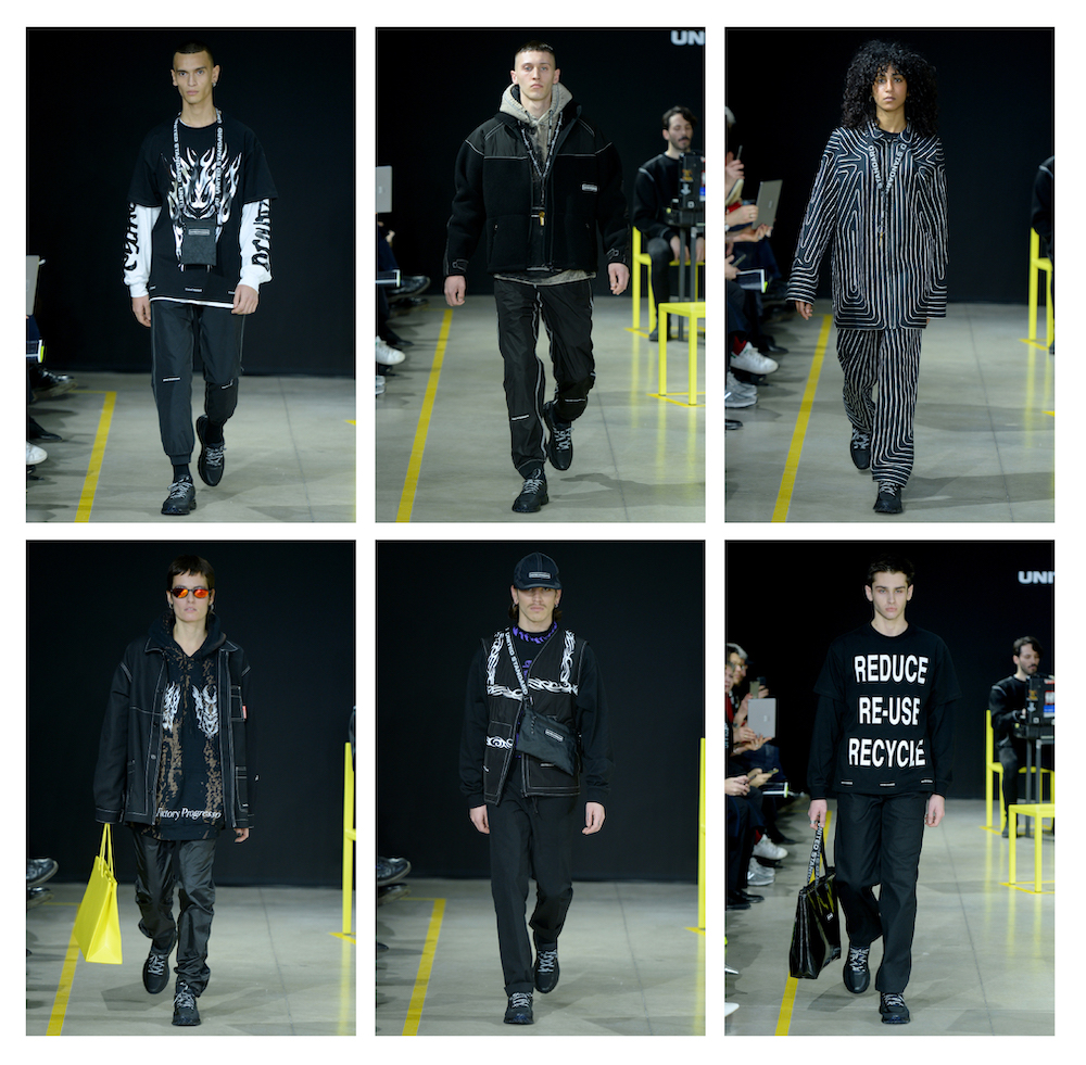 ‘Imagine a rave party in a factory in Italy where there are people making cars and at the same time there are all these lasers,’ said Giorgio Di Salvo, who, for his first official show, “Factory Progresso,” sought to show the technical streetwear DNA of the brand but also a concept.