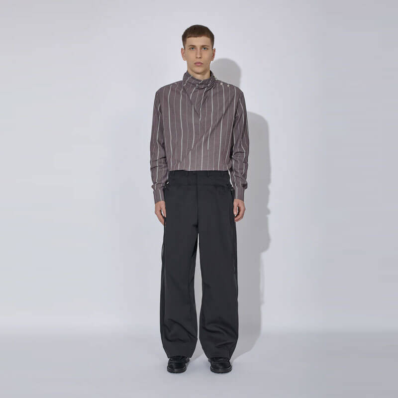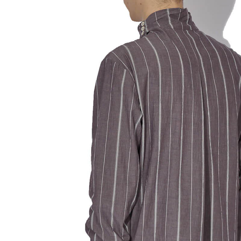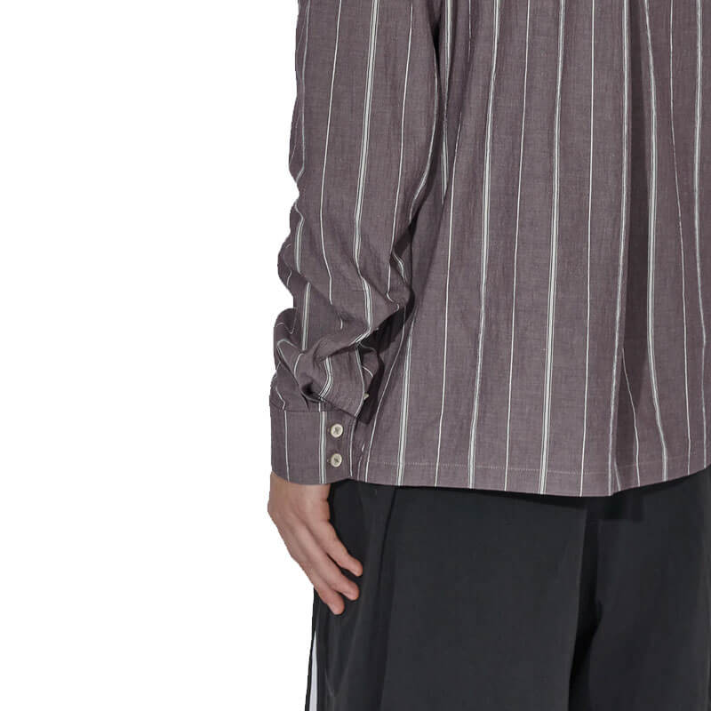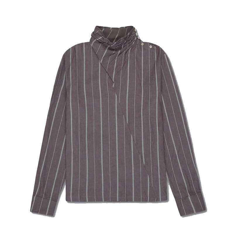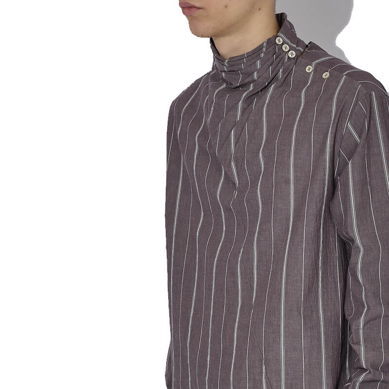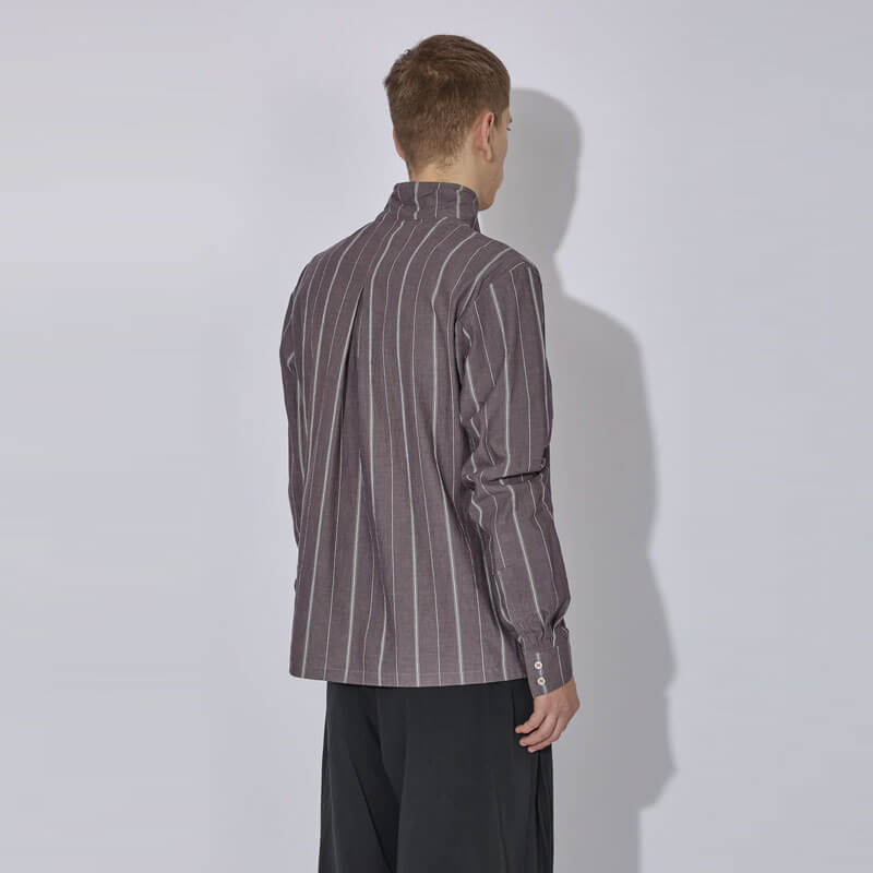 _J.L-A.L_ Dorment Shirt – Burnt Maple: The Dorment Shirt features a pleated wrap collar with an asymmetric button placket, elevating the design with subtle complexity. Available in a seasonal cotton stripe fabric, the shirt merges classic shirting techniques with modern construction.