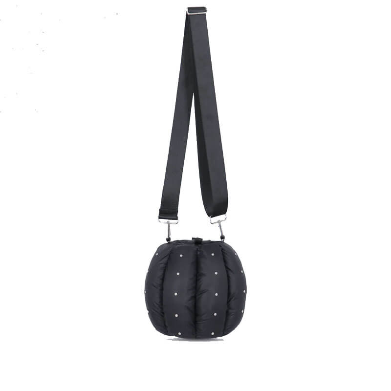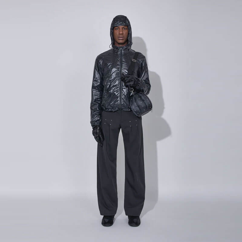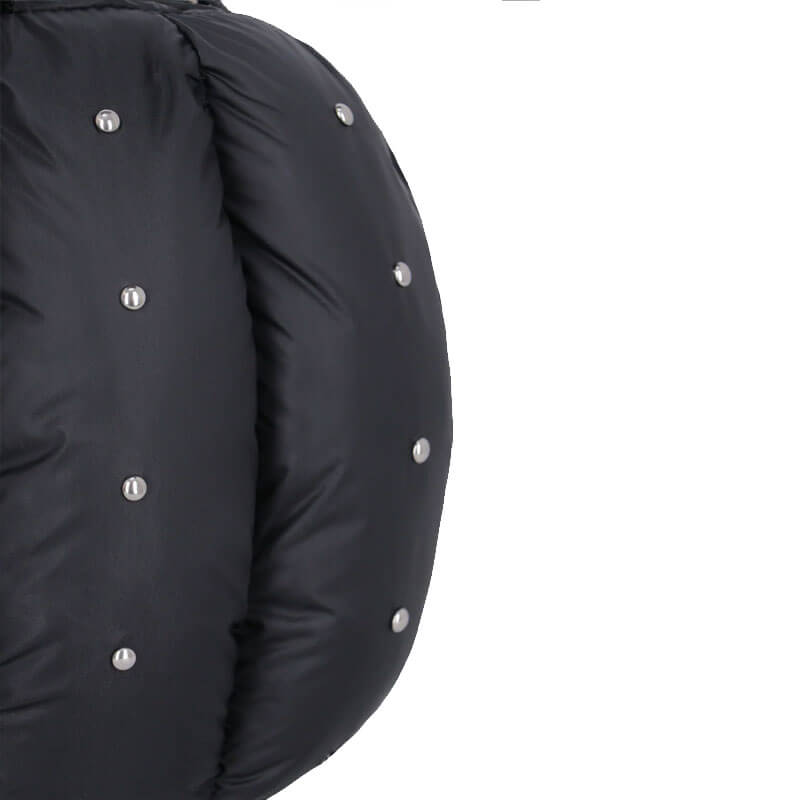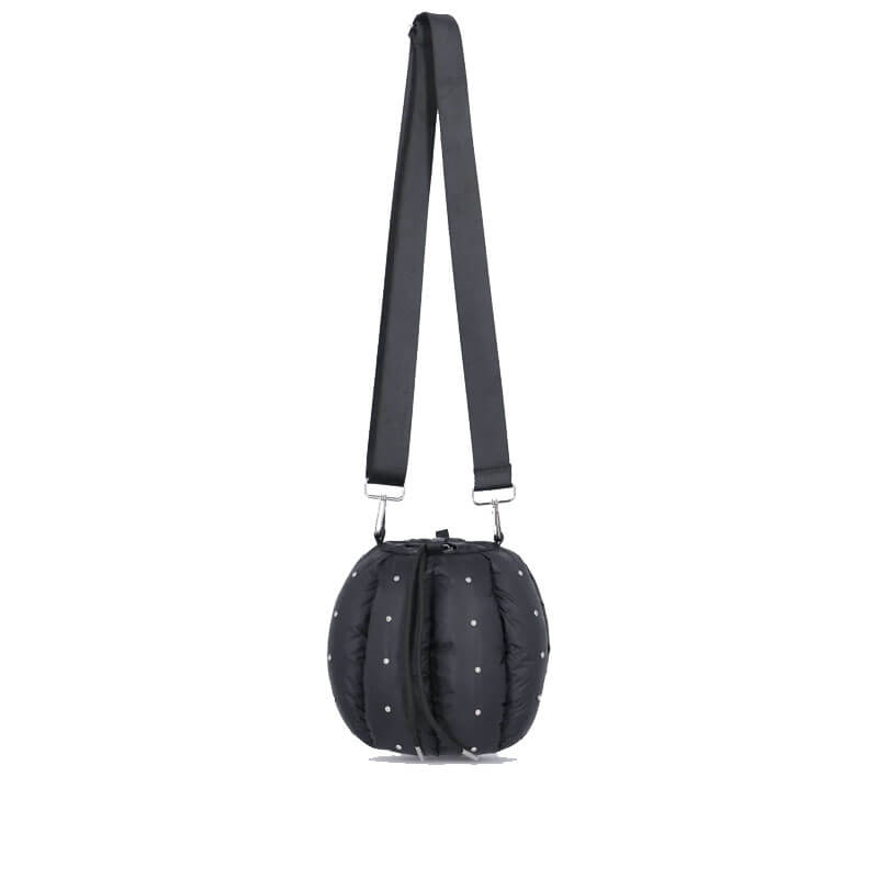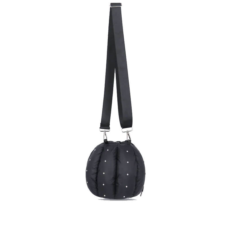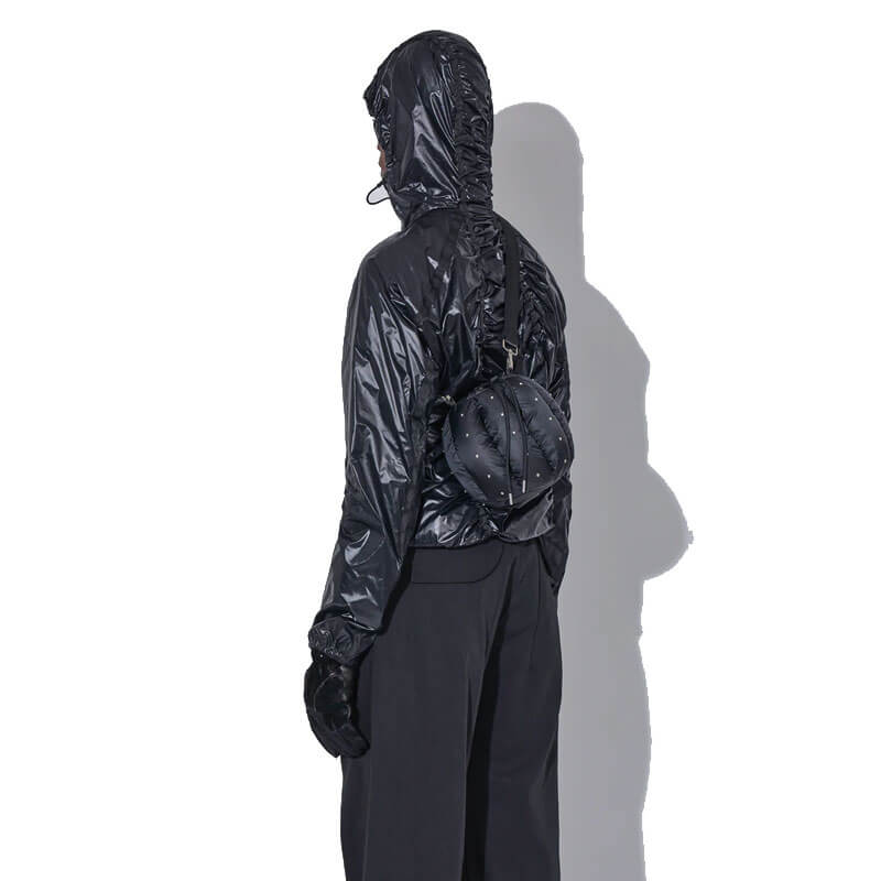 _J.L-A.L_ Sinh Bag – Shungite Black: Crafted from mid-weight wadded melange fabric, the Sinh Bag is inspired by the organic form of sea urchin shells. Featuring a removable strap, stud detailing and drawstring entry, the design merges structural complexity with utility.