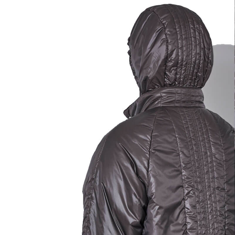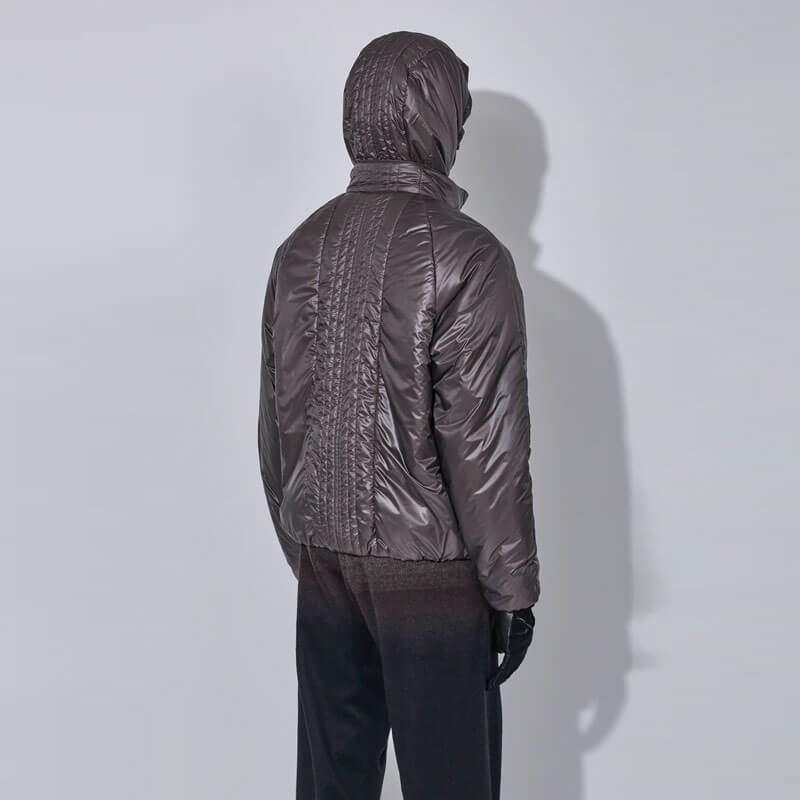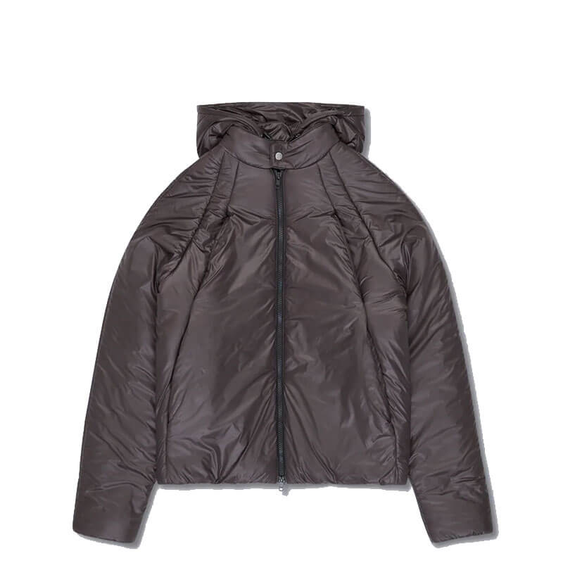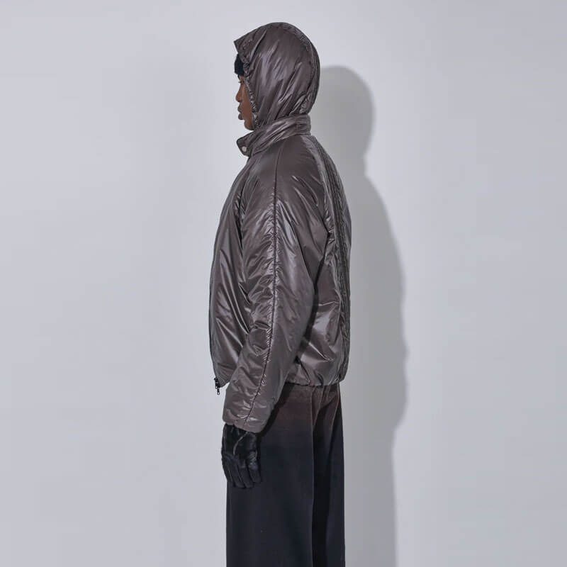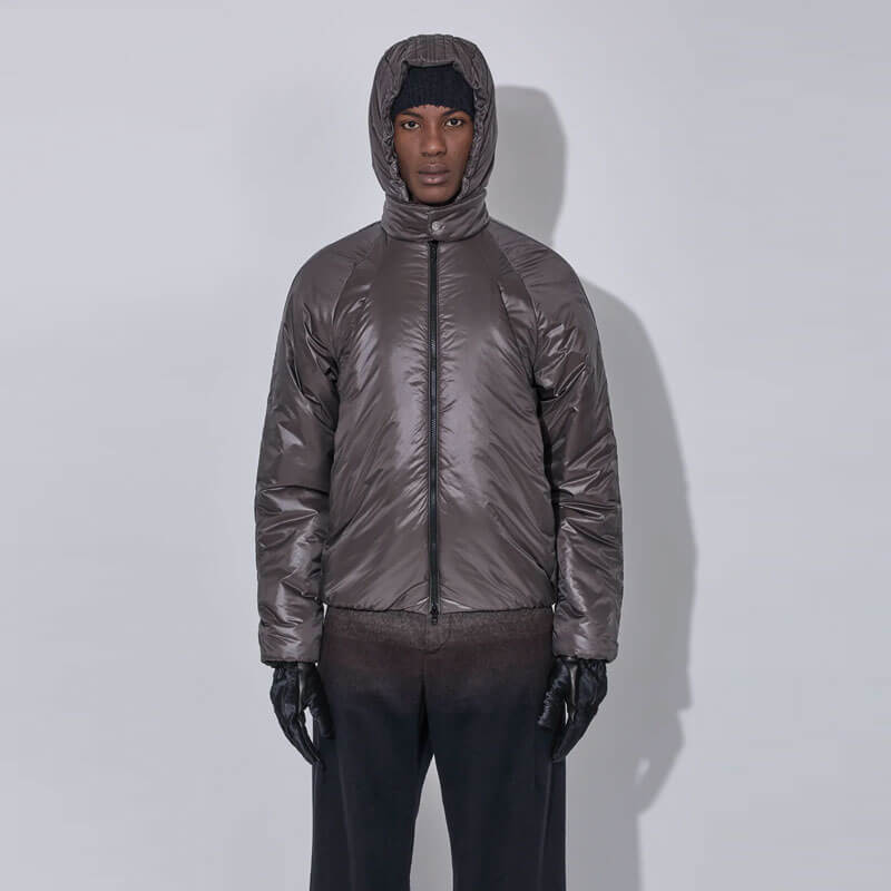 _J.L-A.L_ Sinh Jacket – Seraphim: The Sinh Jacket is crafted from lightweight nylon with a wadded fill, combining insulation with streamlined form. The jacket features a double-fronted construction with a half-gilet internal closure and an elasticated hood opening for a customizable fit.