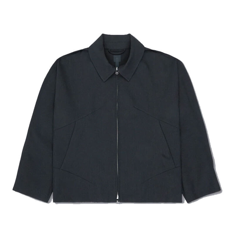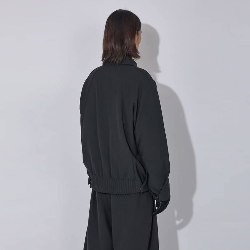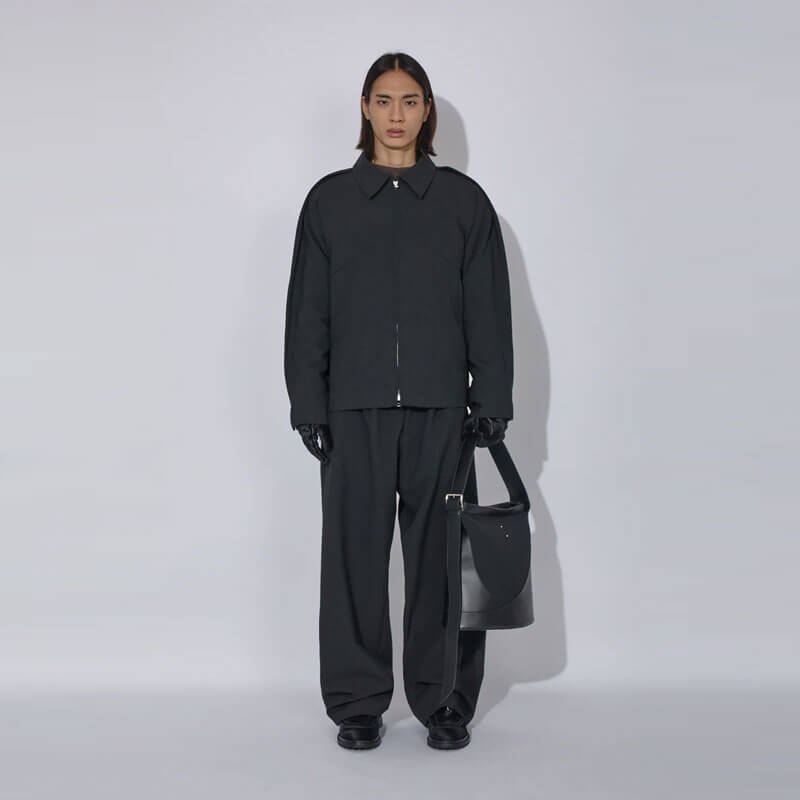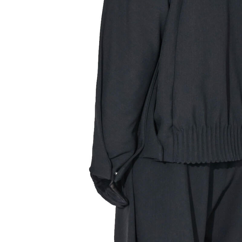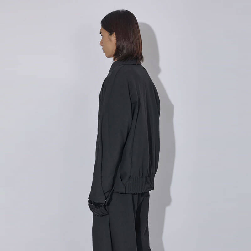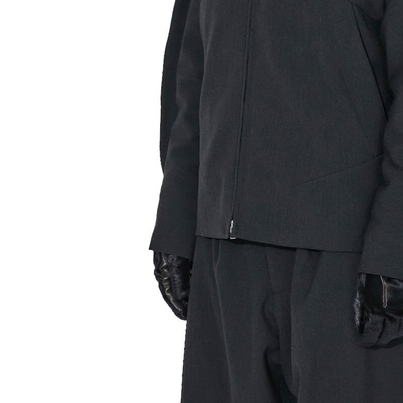 _J.L-A.L_ Uvas Jacket – Shungite Black: The Uvas Jacket is constructed from soft structured double-woven melange fabric, with extensions or ‘fins’ highlighting the overarm and underarm seams. These elements, combined with the dropped armhole construction, create a rounded, dynamic silhouette. The garments technical complexity is infused in detailing, with mirrored cuff tabs, T-cut sleeves, and a darted pocket construction.