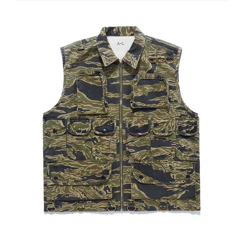 MAHARISHI Ciso Combat Vest – Mint Gold Tigerstripe: A faithfully reproduced Vietnam war camouflage combat vest, originally issued to special forces by the Counterinsurgency Support Office based in Okinawa. Constructed in a durable cotton twill in DPM: Tigerskins, the vest features multiple utility pockets and accessory hanging loops.