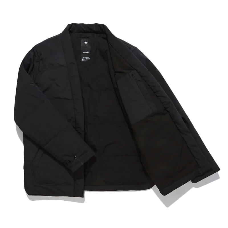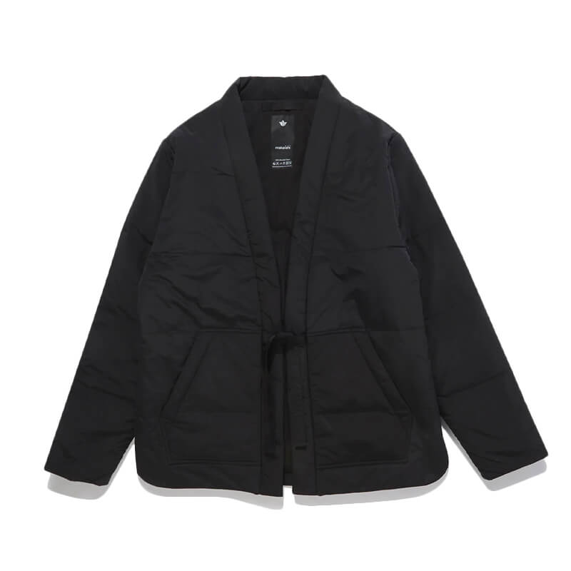 MAHARISHI Padded Hanten Jacket – Black: Padded kimono jacket in black, with Primaloft quilting for high-performance insulation that is lightweight and breathable, makes a versatile mid or outer layering piece. Included in Maharishi’s FW22 collection, this Padded Hanten Jacket features: