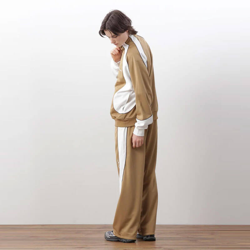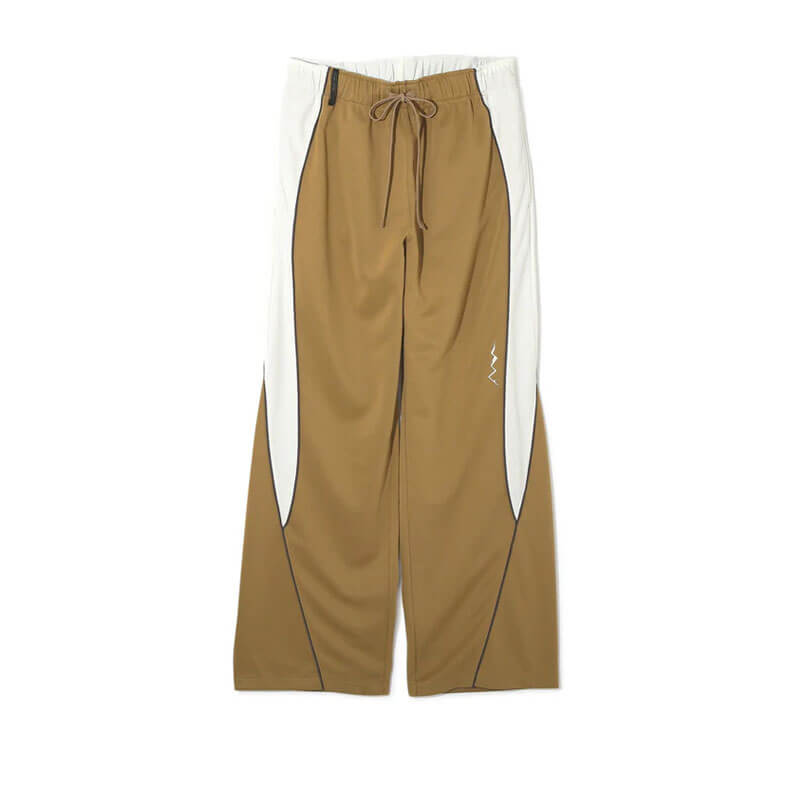 MANASTASH Panel Track Pant – Camel: Track pants made of medium-thick jersey material in a contrast color construction. This pant features with eye-catching curved lines inspired by Y2K and a subtle mountain pattern embroidery on the left knee.