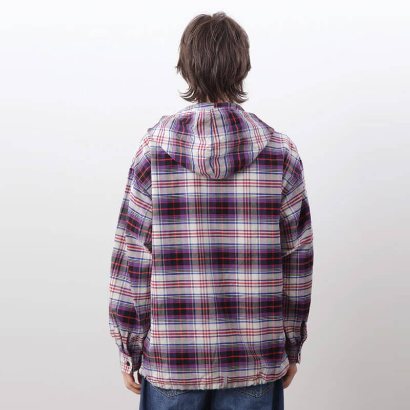MANASTASH Washed Plaid Baja Hoodie – Purple: Manastash-like design that combines Mexican parka and anorak details. Crafted in original tartan check pattern printed on basic medium-thick Oxford fabric, this garment is finished with a pigment dyeing and ball bio second-hand processing creates a realistic vintage feel as if it has been worn for years.