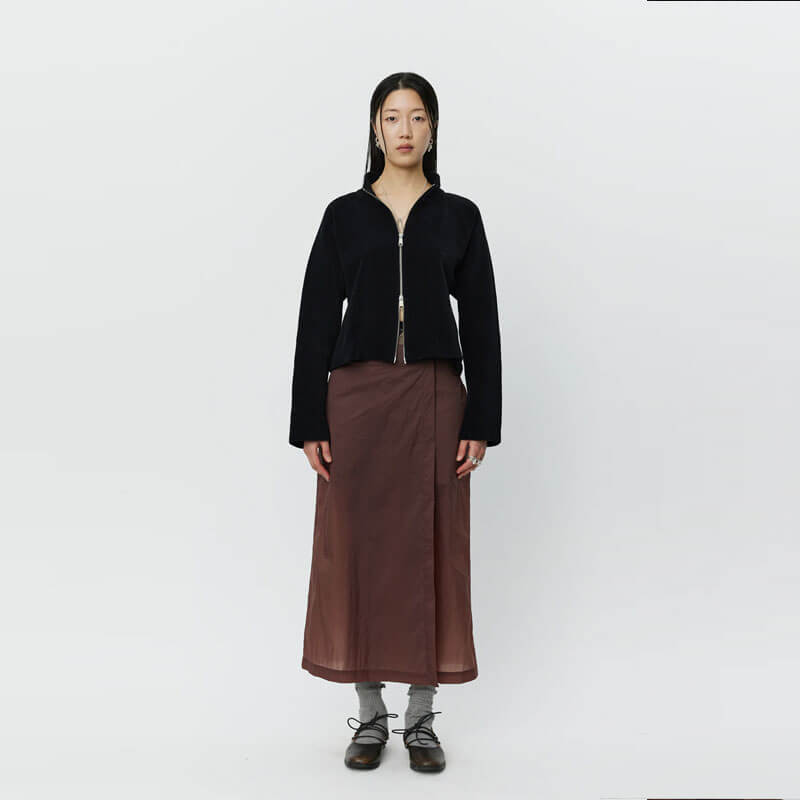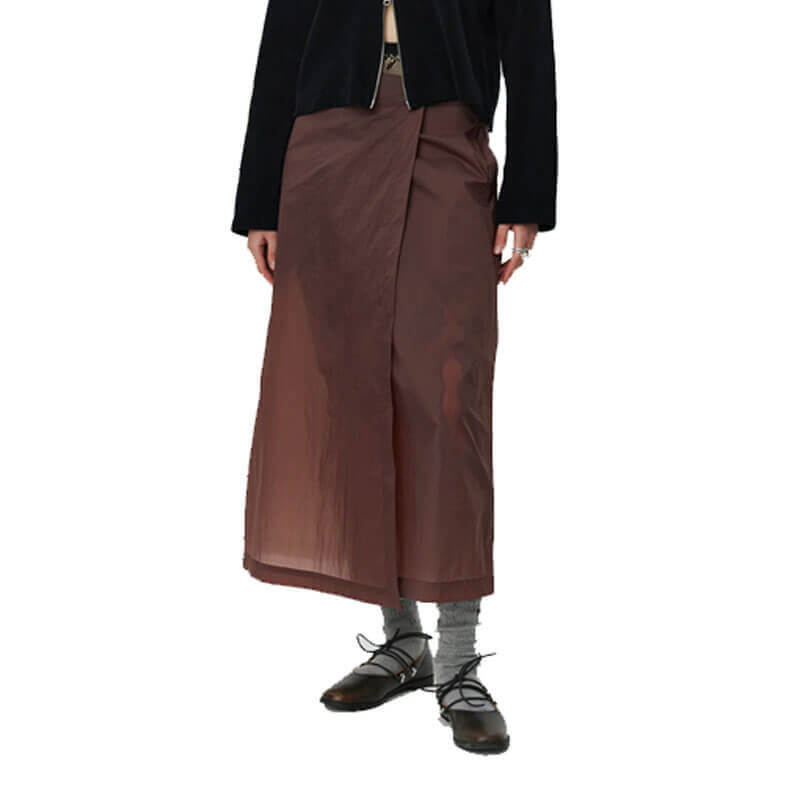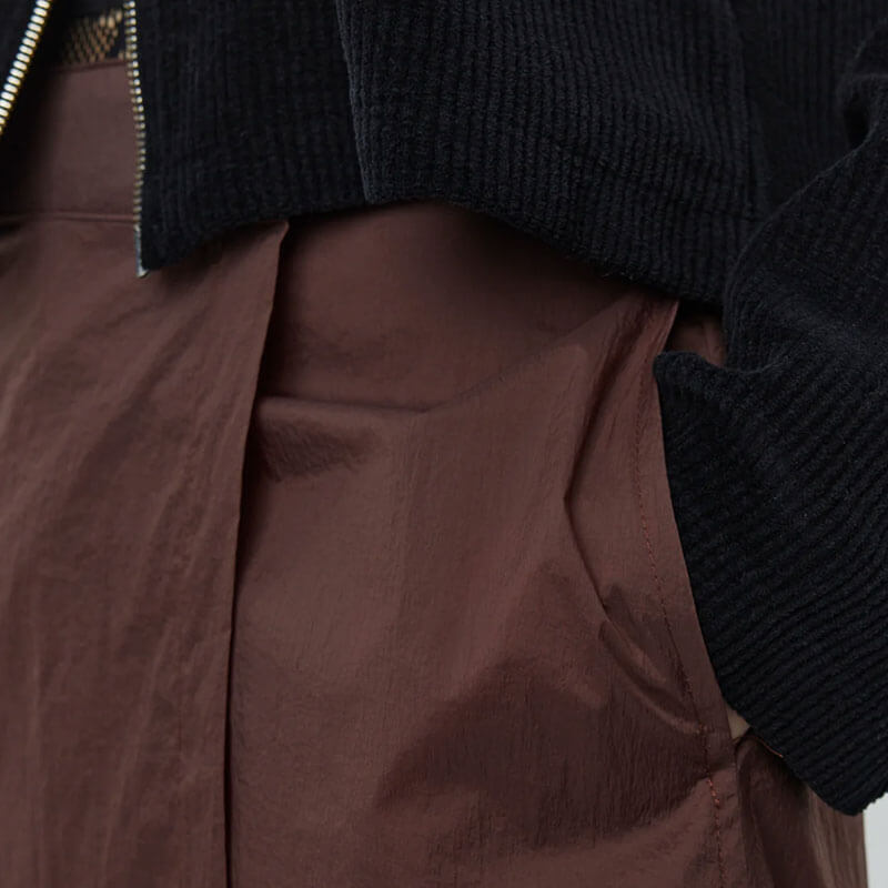 MFPEN Classic Wrap Skirt – Merlot Crinkled Tech: The Classic Wrap Skirt is calf length with a regular fit. Featuring a button fastening at the front, two side pockets and a patch pocket at the rear. Cut from a crinkled recycled nylon in a dark copper.