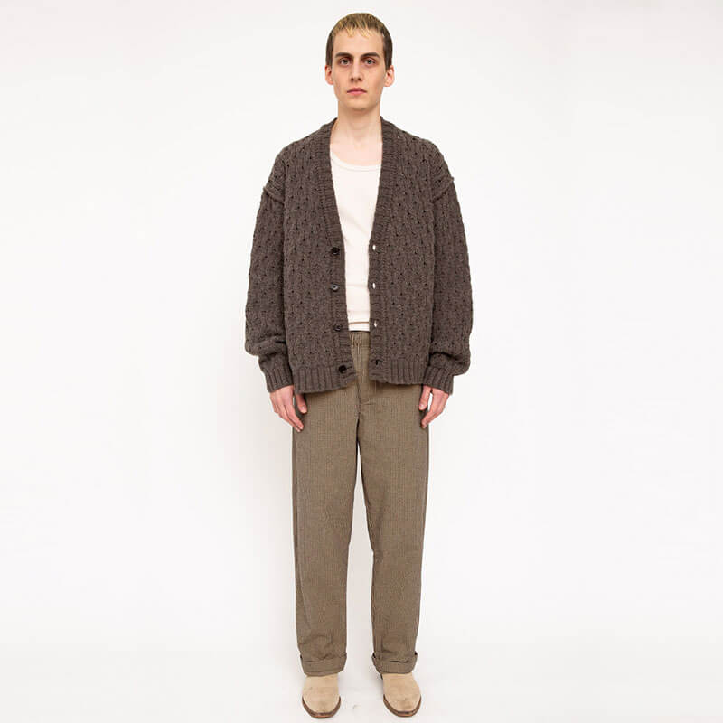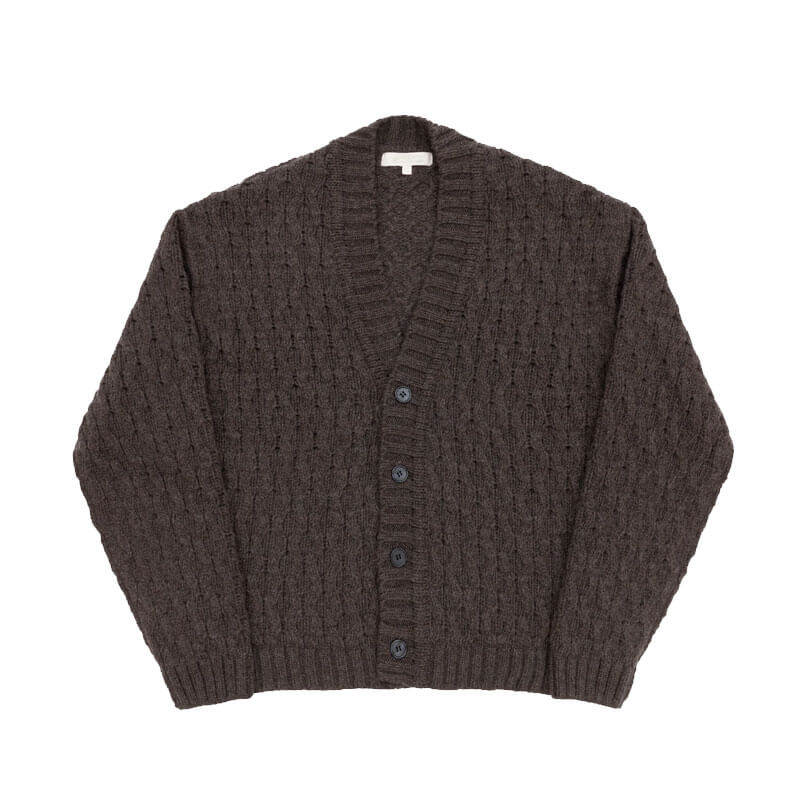 MFPEN Fence Cardigan – Brown: Boxy fit cardigan in cable knit crafted in recycled wool. This cardigan features four button placket with ribbed v-collar, cuffs and hem. Made from recycle wool yarn, by making this garment no new fabrics were produced. Included in MFPEN’s FW22 collection, this Fence Cardigan – Brown features: