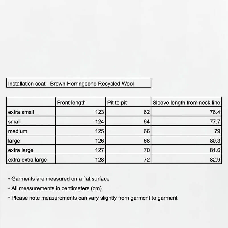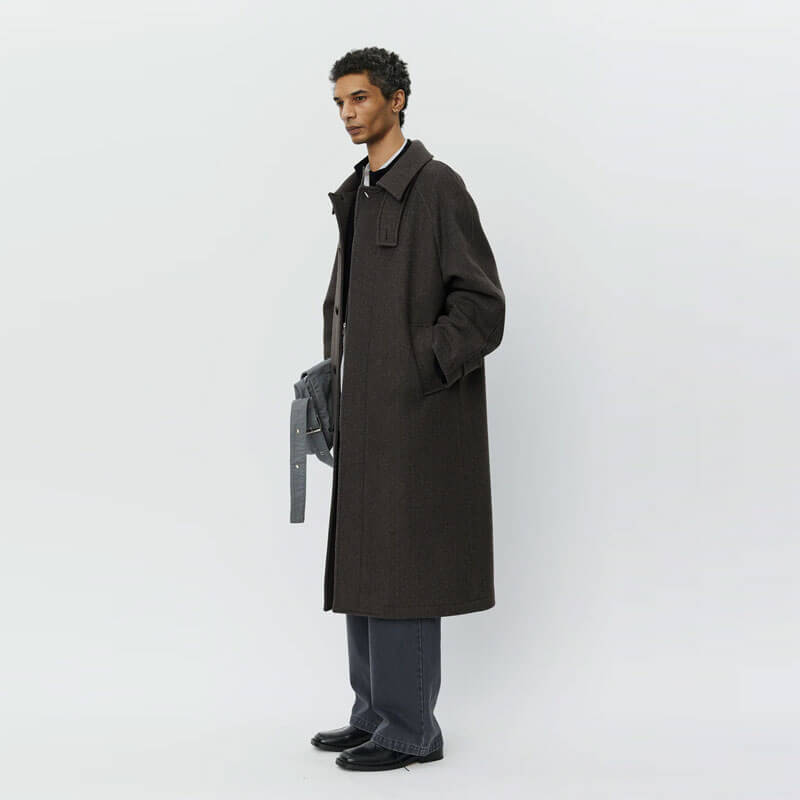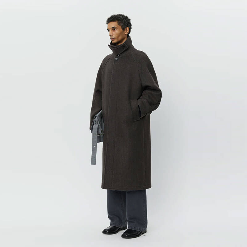 MFPEN Installation Coat – Brown Herringbone: The Installation Coat is calf length with an oversized fit and raglan sleeves. Made with hidden button closure, removable storm collar tab, side pockets and rear vent. Cut from post-consumer recycled melton wool in a grey brown herringbone.