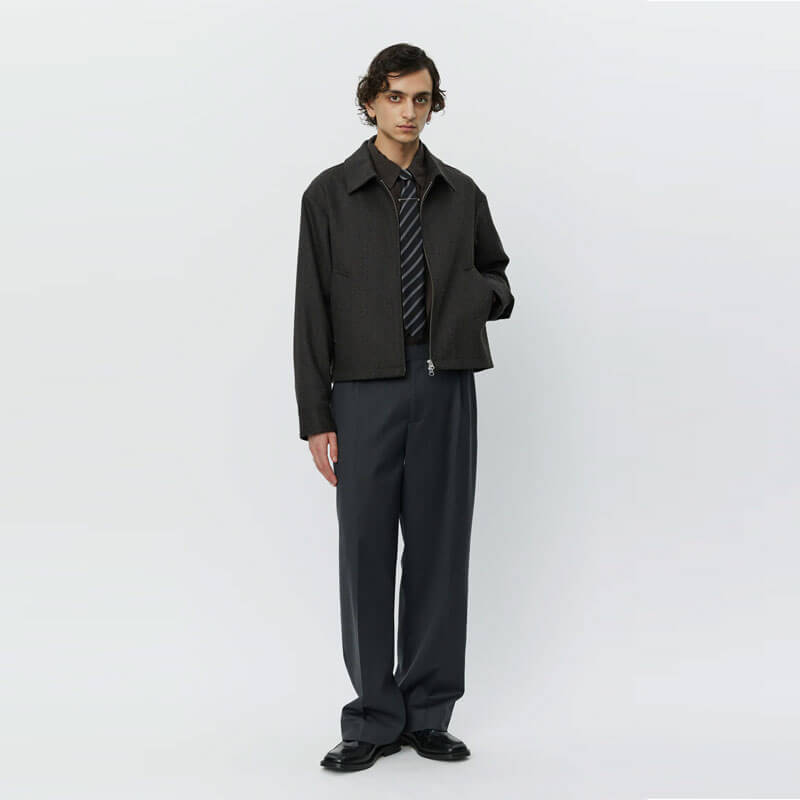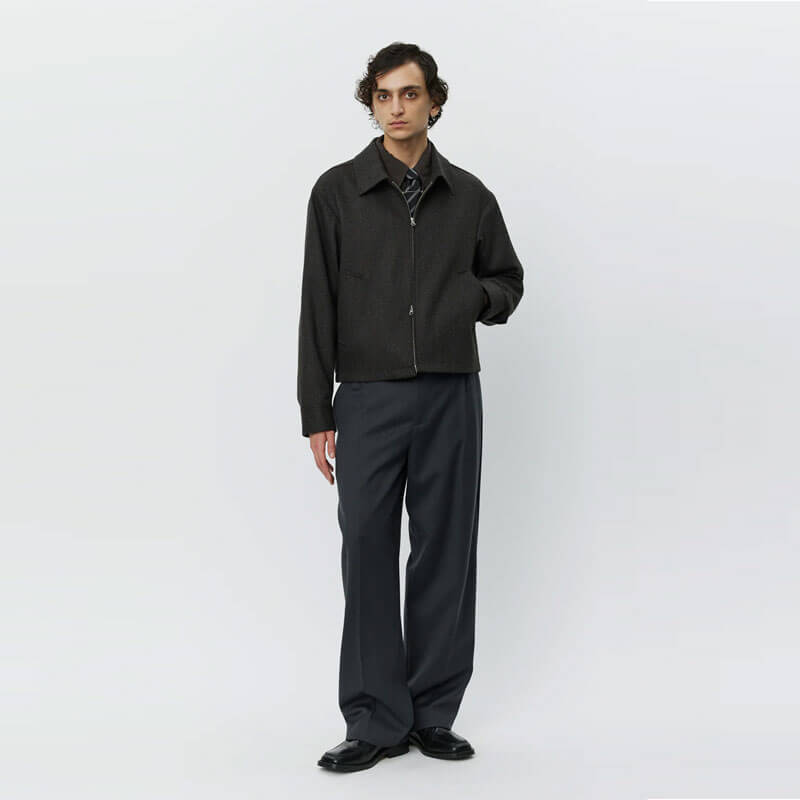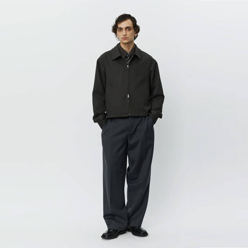MFPEN Mail Jacket – Dark Grey Wool: The Mail Jacket has a boxy fit with drop shoulders. Featuring two-way zip, side pockets, sleeve and front body lining and adjustable tabs at the waist. Cut from a lightweight, crisp tropical wool in dark grey.