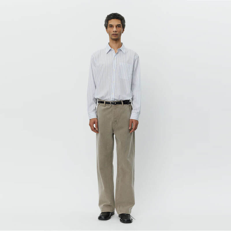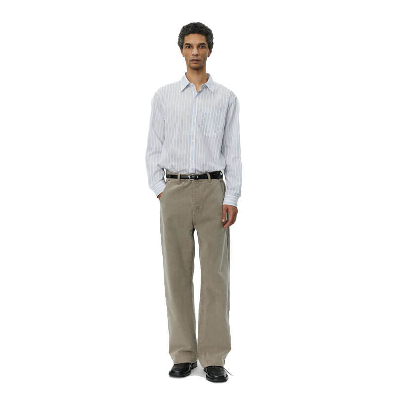 MFPEN Straight Cut Jeans – Brushed Mudstone: The Straight Cut Jeans has a relaxed straight fit with a mid-rise. Featuring side pockets, rear patch pockets, flower rivets, metal button closure and YKK zip fly. Cut from a soft mineral dye washed organic cotton denim with a brushed surface in a light brown.